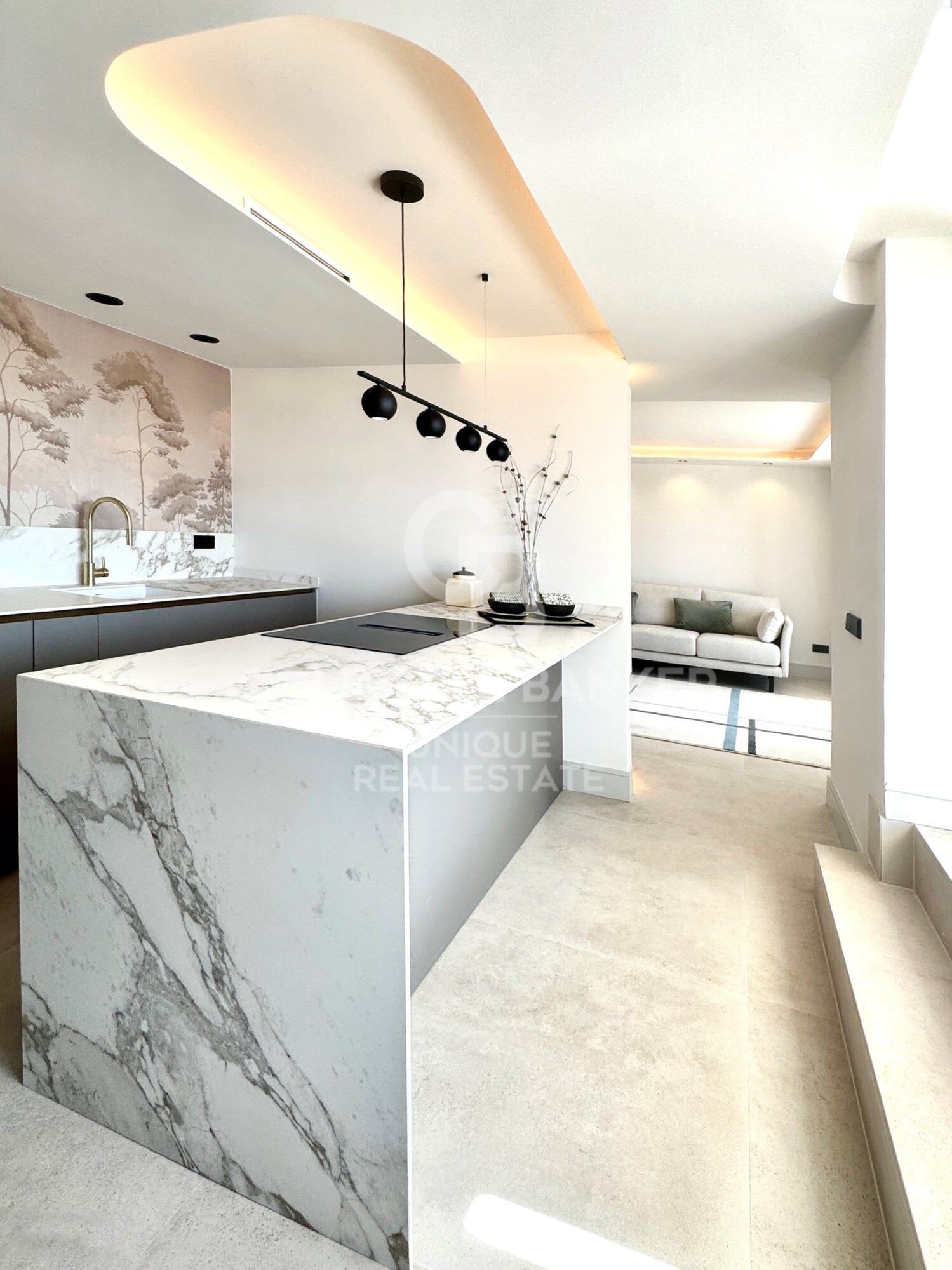 Der Zugang zum Penthouse erfolgt über eine repräsentative Eingangshalle, die zu einem geräumigen Wohn-Esszimmer mit einem dekorativen Dampfkamin führt, der sich ideal eignet, um eine gemütliche und anspruchsvolle Atmosphäre zu schaffen. Die Küche mit modernem Design ist komplett mit Geräten der Top-Marke ausgestattet und hat eine dreijährige Garantie. Der Schlafbereich besteht aus drei Schlafzimmern, zwei davon en suite, und drei Badezimmern, die alle hochwertig ausgestattet sind.