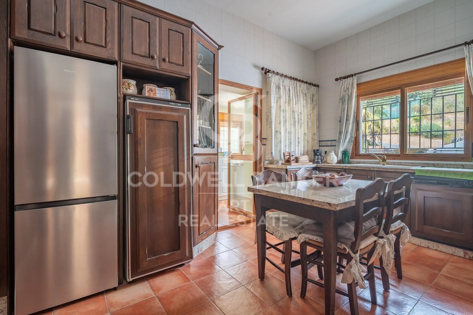 Diese außergewöhnliche Luxusvilla liegt in einem abgeschiedenen Rückzugsort nahe La Mairena und bietet absolute Privatsphäre inmitten unberührter Natur. Auf einem erhöhten Grundstück von 5 Hektar gelegen, eröffnet sich ein spektakulärer Panoramablick auf die umliegende Landschaft, die Küste und das Mittelmeer. Die Hauptresidenz erstreckt sich über zwei Etagen und ist durch einen Aufzug verbunden. Im Erdgeschoss befinden sich ein großzügiger Wohnbereich mit angrenzender Bibliothek, eine voll ausgestattete Küche, ein elegantes Esszimmer sowie ein gemütliches Wohnzimmer mit Kamin. Drei luxuriöse Schlafzimmer-Suiten, zwei davon mit eigenen Wohnzimmern, bieten höchsten Wohnkomfort. Diese Bereiche sind durch einen stilvollen Flur mit Gewölbedecken miteinander verbunden. Zusätzlich befinden sich auf dieser Ebene ein Fitnessbereich mit Jacuzzi, zwei Gäste-WCs, ein Waschraum und Abstellräume. Unabhängig vom Haupthaus befinden sich ein überdachtes Schwimmbad mit Umkleide und WC, eine Garage für sechs Autos sowie ein komplett ausgestattetes Personalapartment. Mehrere Terrassen, Veranden und charmante Innenhöfe bieten ein einzigartiges Outdoor-Erlebnis. Im Obergeschoss befindet sich eine offene Lounge, das luxuriöse Hauptschlafzimmer, ein zusätzliches Wohnzimmer oder Gästezimmer - alle mit Zugang zu großzügigen Terrassen und atemberaubendem Meerblick. Zwei voll ausgestattete Badezimmer runden diese Etage ab. Das Anwesen ist umgeben von einem perfekt gepflegten Garten mit Obstbäumen, alten Pflanzen, Teichen, kunstvollen Brunnen, Skulpturen und ruhigen Wasserspielen. Eine kleine separate Hütte mit 360-Grad-Aussicht dient als Atelier oder Raum für kreative Hobbys. Trotz der ruhigen Lage ist die Villa hervorragend angebunden - nur 30 Minuten von Marbella-Zentrum, 15 Minuten vom Strand und 5 Minuten von La Mairena entfernt. #ref:CBSH1027