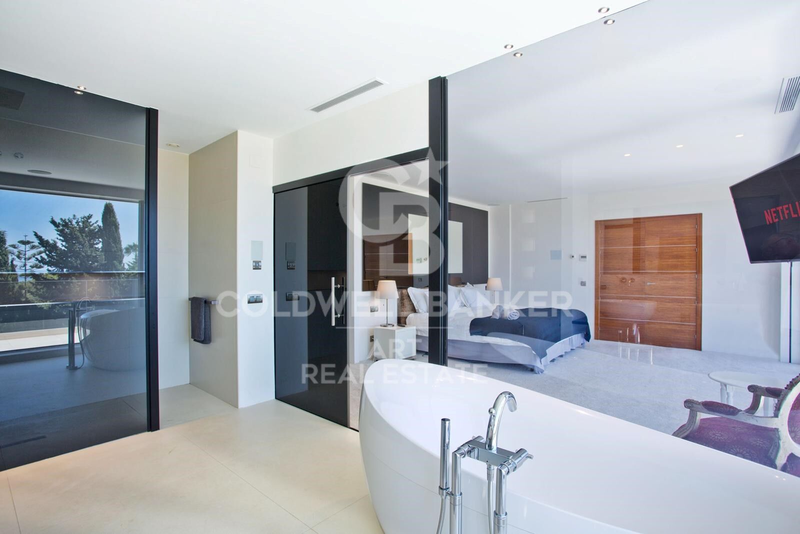 Die gesamte erste Etage ist einer großzügigen Master-Suite mit Lounge, Bar, luxuriösem Badezimmer, Ankleidezimmer und durchgehender Terrasse gewidmet. Darüber hinaus bietet eine große Dachterrasse eine spektakuläre Aussicht - perfekt für ein privates Sonnenbad oder Zusammenkünfte bei Sonnenuntergang.