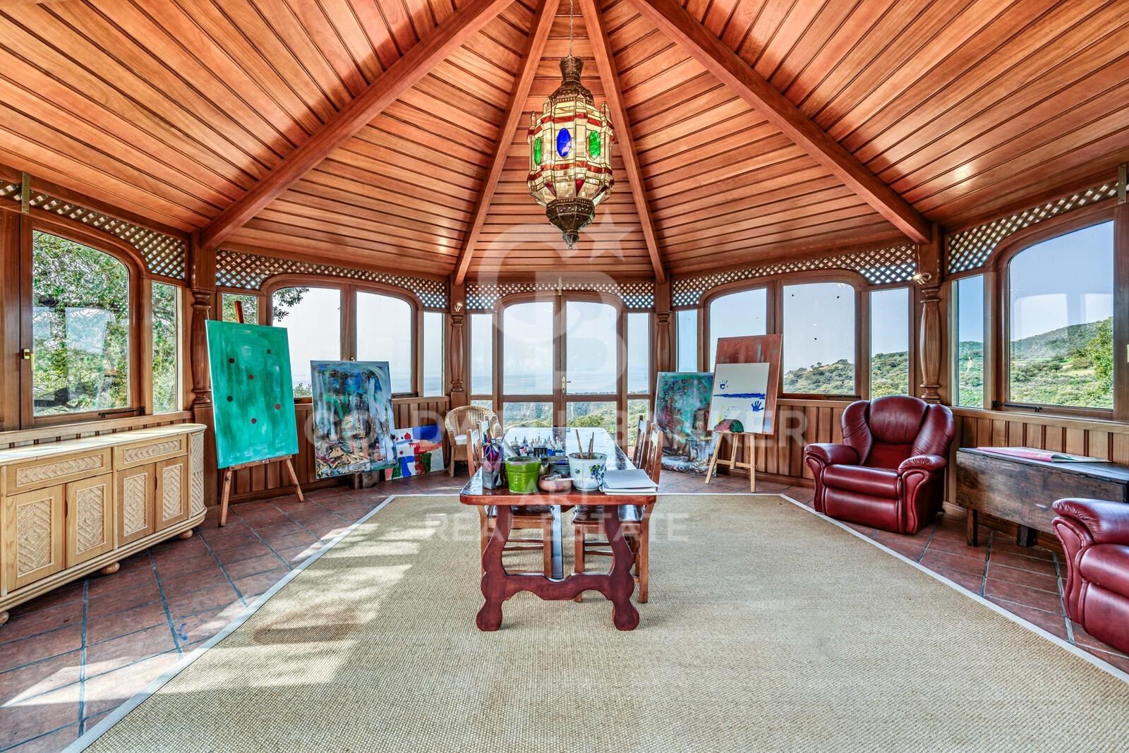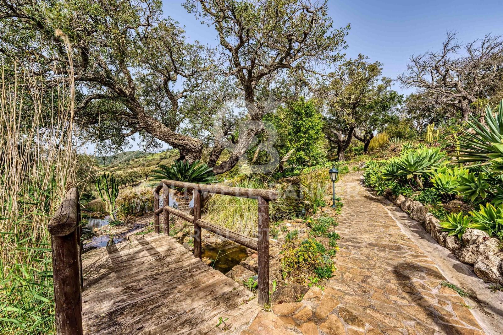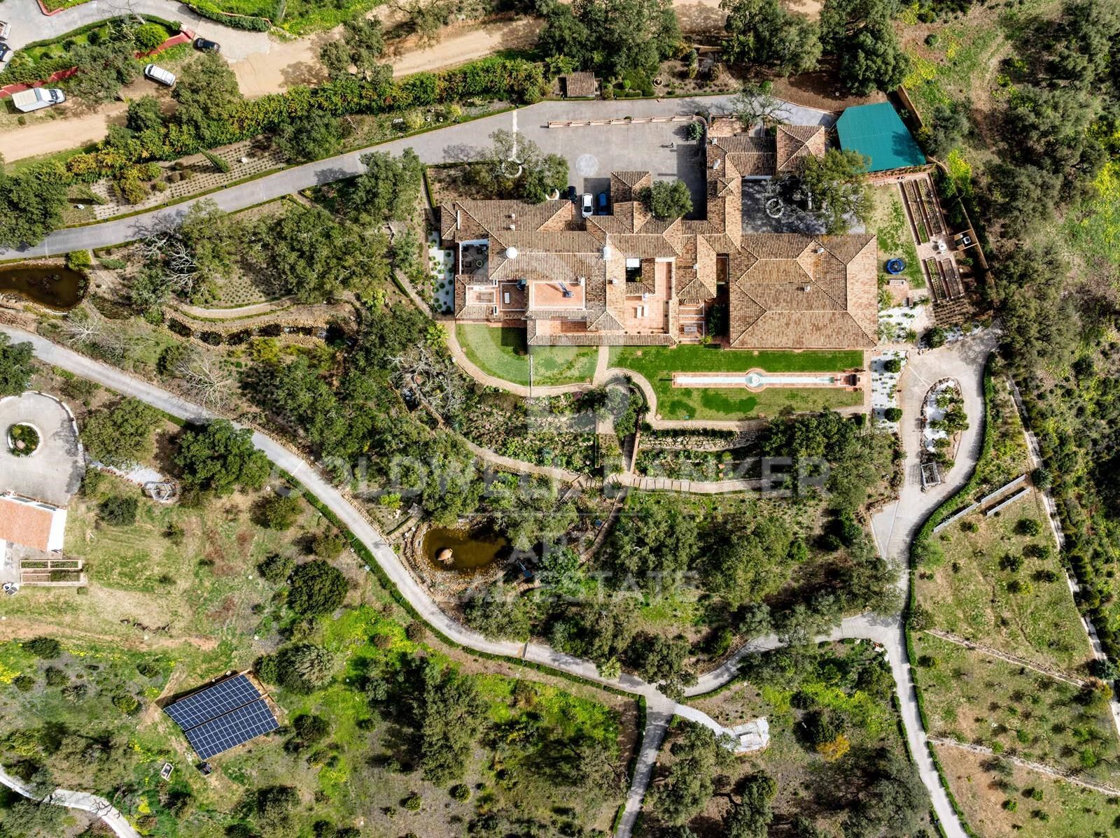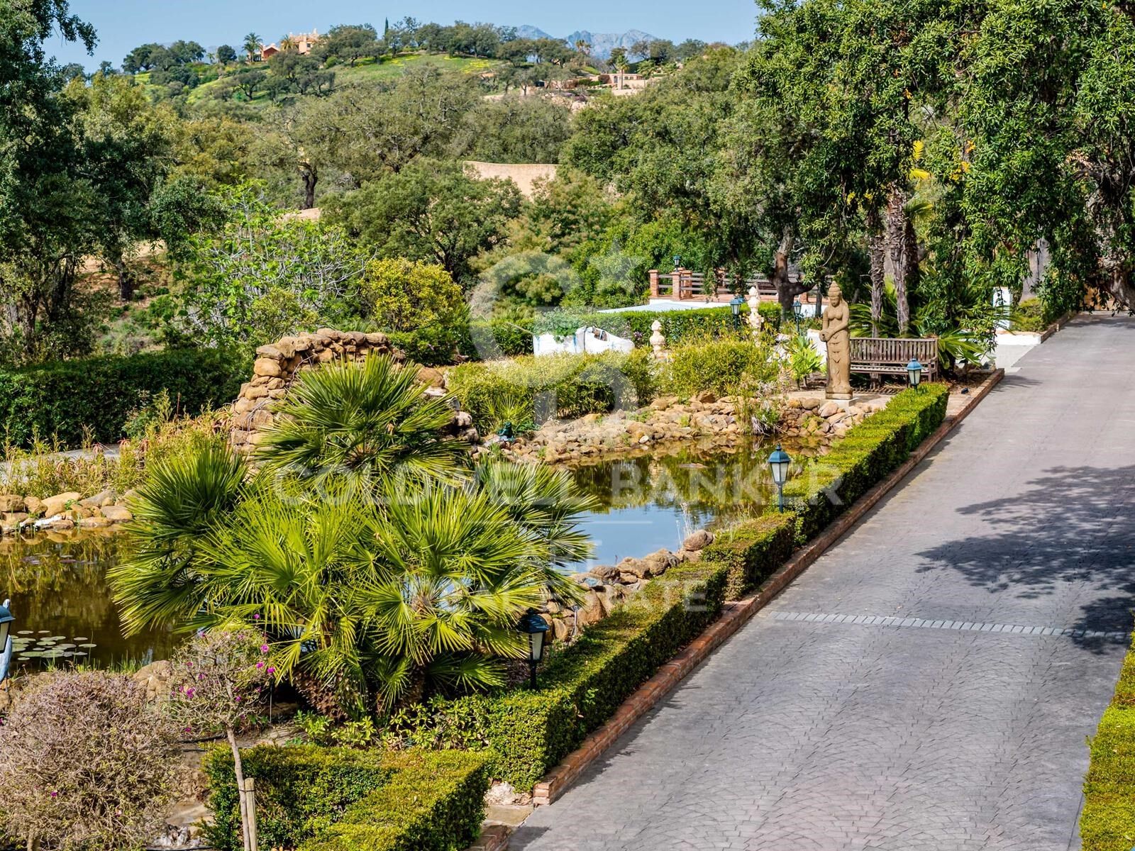 Das Anwesen ist umgeben von einem perfekt gepflegten Garten mit Obstbäumen, alten Pflanzen, Teichen, kunstvollen Brunnen, Skulpturen und ruhigen Wasserspielen. Eine kleine separate Hütte mit 360-Grad-Aussicht dient als Atelier oder Raum für kreative Hobbys.