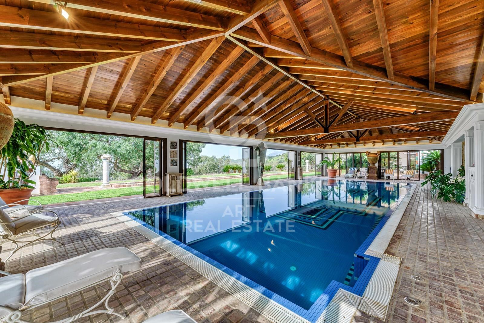 Unabhängig vom Haupthaus befinden sich ein überdachtes Schwimmbad mit Umkleide und WC, eine Garage für sechs Autos sowie ein komplett ausgestattetes Personalapartment. Mehrere Terrassen, Veranden und charmante Innenhöfe bieten ein einzigartiges Outdoor-Erlebnis.