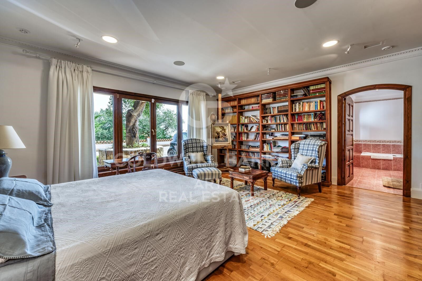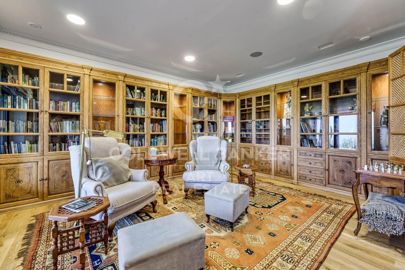 Die Hauptresidenz erstreckt sich über zwei Etagen und ist durch einen Aufzug verbunden. Im Erdgeschoss befinden sich ein großzügiger Wohnbereich mit angrenzender Bibliothek, eine voll ausgestattete Küche, ein elegantes Esszimmer sowie ein gemütliches Wohnzimmer mit Kamin. Drei luxuriöse Schlafzimmer-Suiten, zwei davon mit eigenen Wohnzimmern, bieten höchsten Wohnkomfort. Diese Bereiche sind durch einen stilvollen Flur mit Gewölbedecken miteinander verbunden. Zusätzlich befinden sich auf dieser Ebene ein Fitnessbereich mit Jacuzzi, zwei Gäste-WCs, ein Waschraum und Abstellräume.