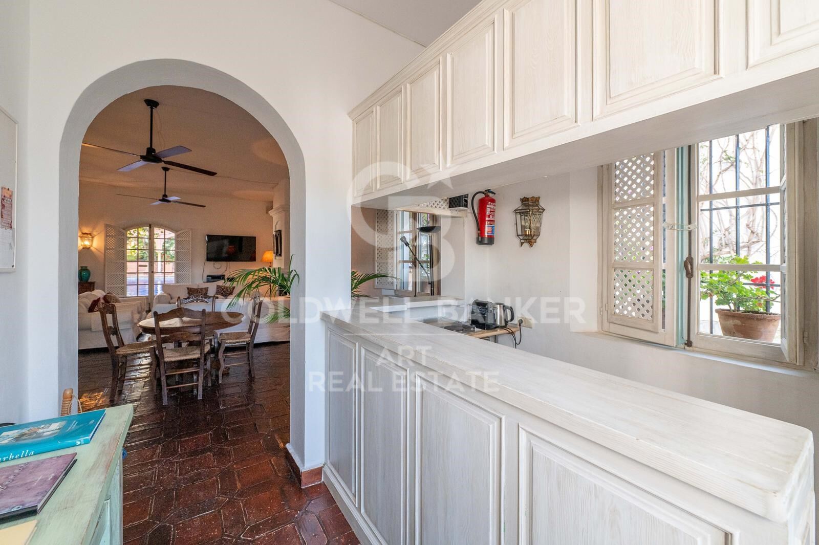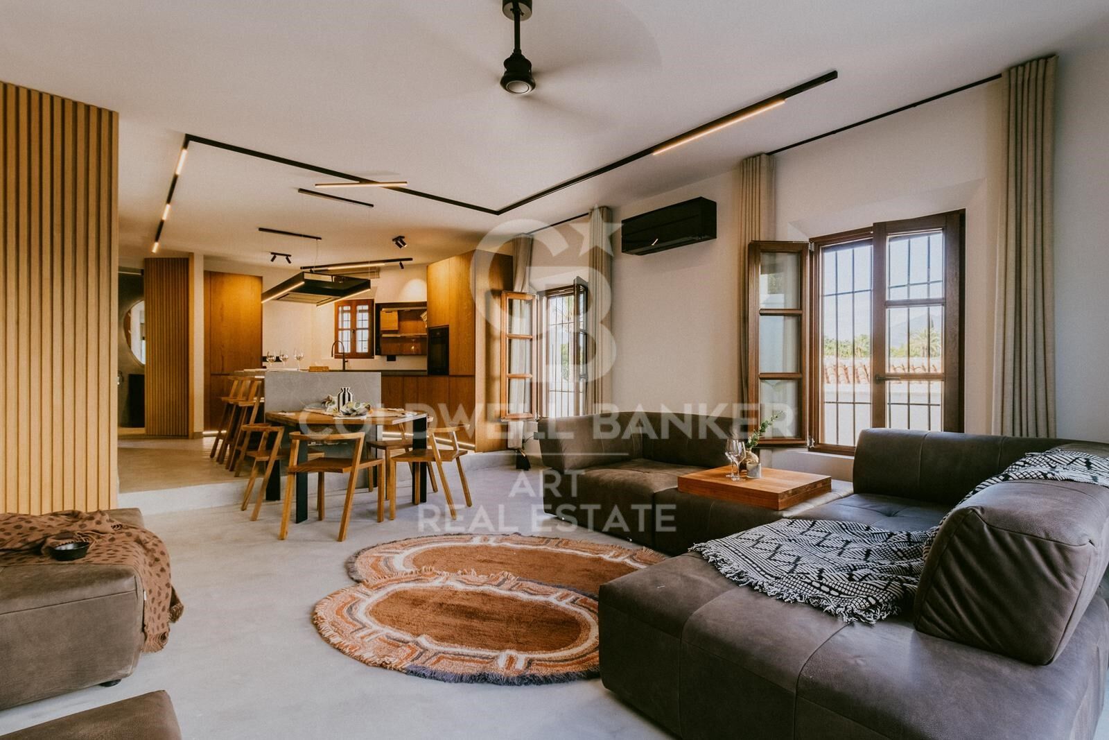 Das geräumige, offene Wohn-Esszimmer ist von natürlichem Licht durchflutet und schafft eine warme und elegante Atmosphäre, die sich sowohl zum täglichen Entspannen als auch zur Unterhaltung eignet. Große Glastüren verbinden sich mit einem charmanten privaten Innenhof im andalusischen Stil, eine wahre Oase, um die Natur zu genießen.