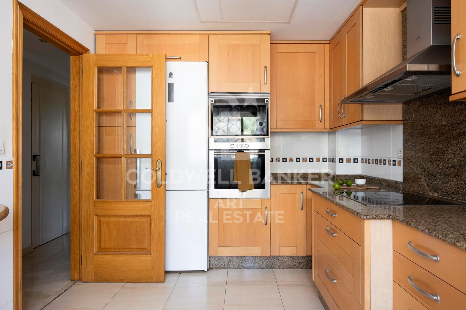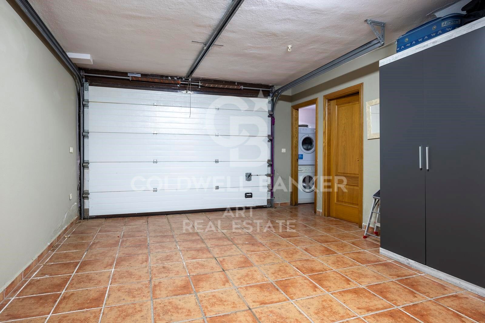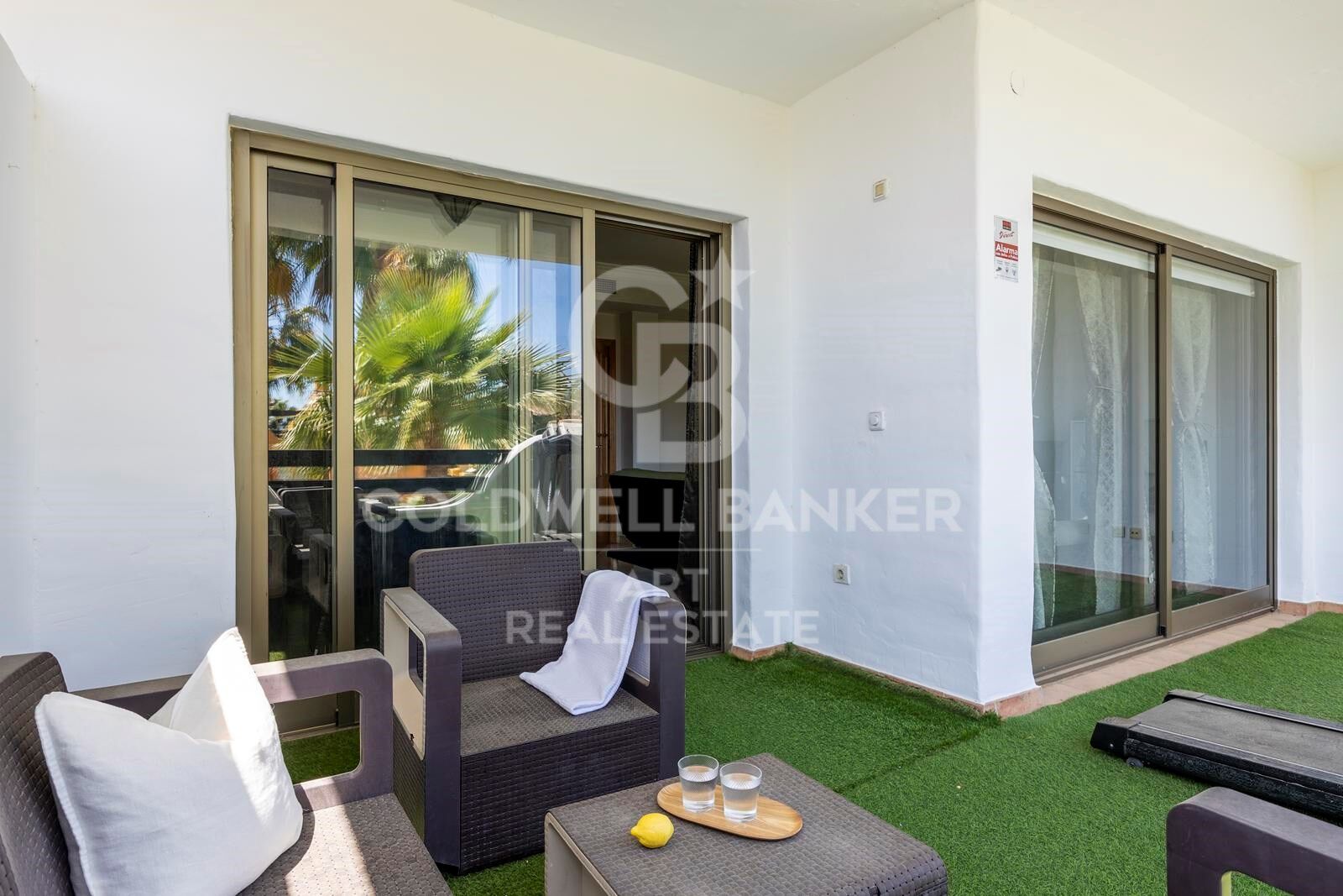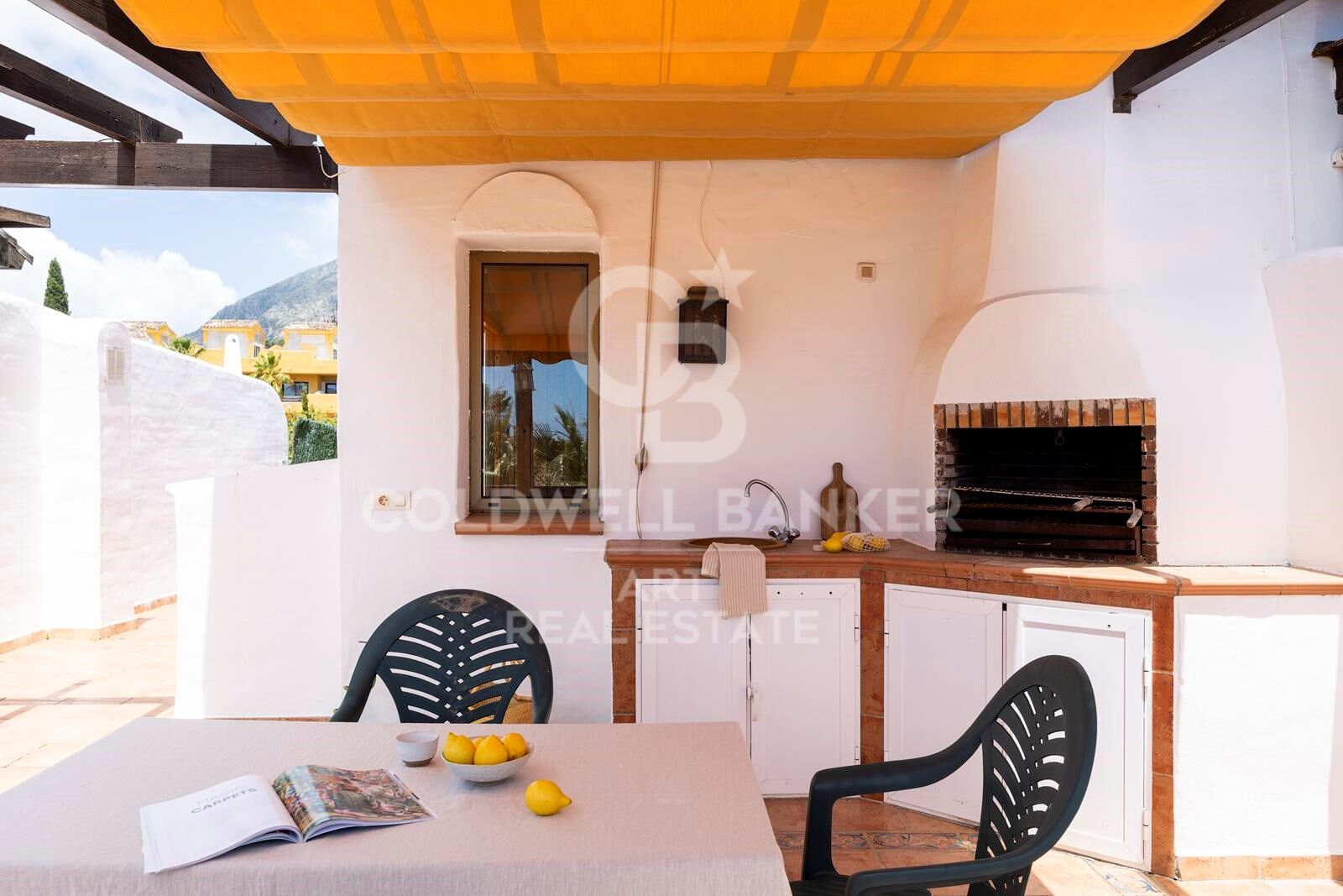 Der offene Wohn- und Essbereich ist lichtdurchflutet und geht nahtlos in die voll ausgestattete moderne Küche mit viel Stauraum über. Die Garage für zwei Fahrzeuge bietet einen direkten Zugang ins Haus und sorgt für zusätzlichen Komfort und Sicherheit. Die private Gartenterrasse mit Palmen führt zum schön angelegten Gemeinschaftspool, der nur von wenigen Anwohnern genutzt wird.