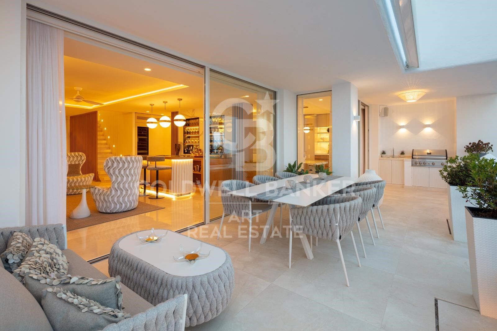 In vollkommener Harmonie gebaut, verschmelzen Innen- und Außenbereiche nahtlos und schaffen eine entspannte Atmosphäre mit gemütlichen Unterhaltungszonen. Genießen Sie das mediterrane Klima auf den großzügigen Terrassen mit Außenküche, durchflutet vom Licht und begleitet vom Klang des Meeres. Mit einer beeindruckenden Fläche von 454 m² und 211 m² Terrassen wurde jeder Raum mit höchster Qualität, natürlichen Materialien und eleganten Möbeln gestaltet.