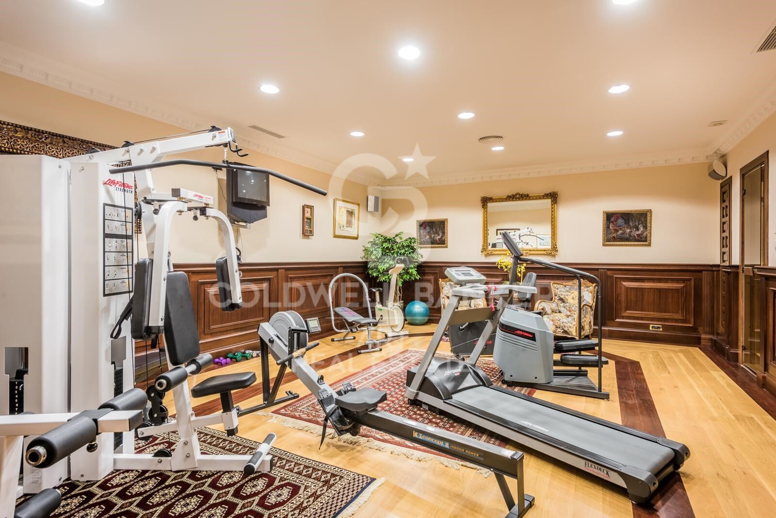 Das Untergeschoss bietet Platz für eine Garage mit 10 Stellplätzen, einen Weinkeller, eine Werkstatt, einen Abstellraum, eine Waschküche, ein Fitnessstudio mit Sauna und Dusche sowie ein separates Personalapartment mit eigenem Zugang. Dieses besteht aus einem hellen Wohnzimmer, einem Schlafzimmer mit Bad und einer voll ausgestatteten Küche mit Essbereich. Auch der Wassertank und der Technikraum befinden sich auf dieser Ebene.