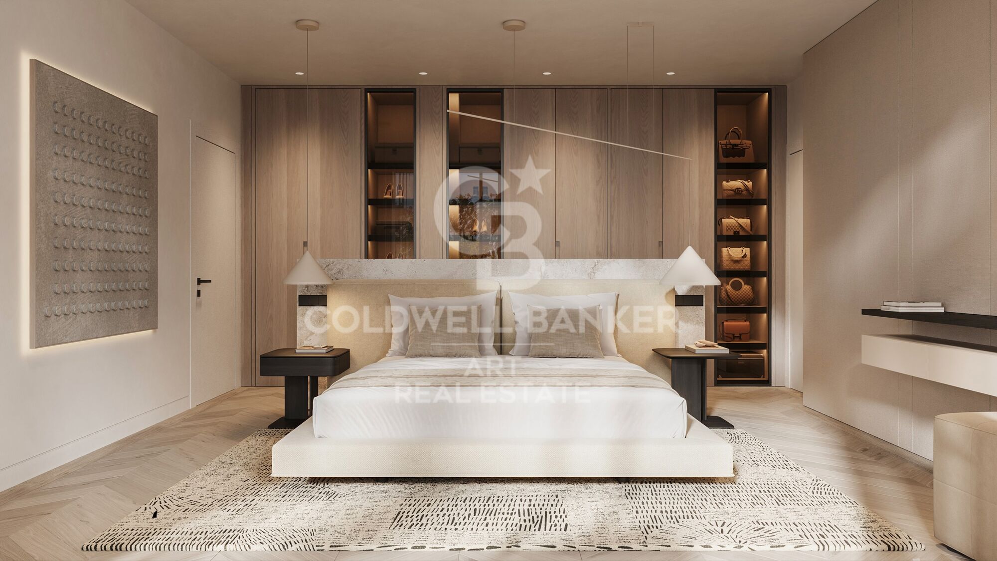 Im Obergeschoss bietet die Hauptsuite einen Ankleideraum, ein großzügiges Badezimmer und direkten Zugang zu einem privaten Außenbereich. Zwei weitere Schlafzimmer mit Ankleidezimmern und En-Suite-Bädern komplettieren diese Etage; eines davon öffnet sich ebenfalls zur Terrasse.