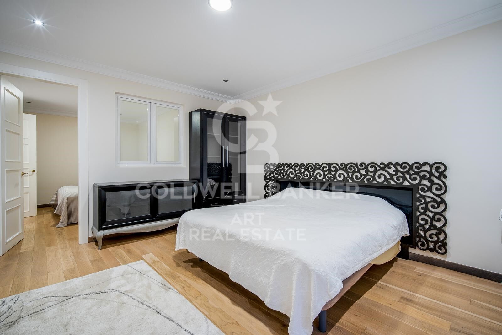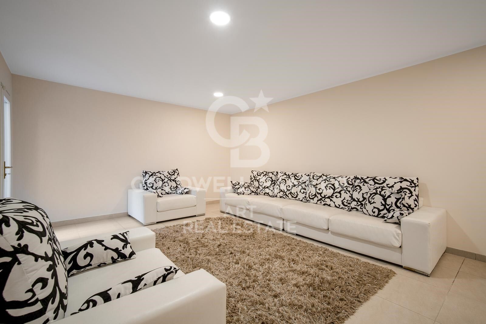 Im Obergeschoss befinden sich die Master-Suite und eine Gästesuite, beide mit Zugang zu einer großen Terrasse mit teilweisem Meerblick, ideal, um das ganze Jahr über das mediterrane Klima zu genießen. Auf der unteren Ebene befinden sich zwei weitere Schlafzimmer, die sich ein Badezimmer teilen, eine Waschküche, einen geräumigen Mehrzweckraum und einen direkten Zugang zur Garage.