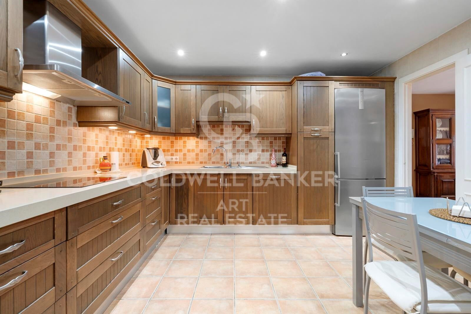 Das helle Wohn- und Esszimmer ist einladend gestaltet, verfügt über einen gemütlichen Kamin und bietet direkten Zugang zu einer teilweise überdachten 30 m² großen Terrasse - ideal zum Essen im Freien oder zum Entspannen in der Sonne. Die voll ausgestattete Küche bietet alle wichtigen Geräte, eine Frühstücksecke sowie einen separaten Hauswirtschafts- und Abstellraum.