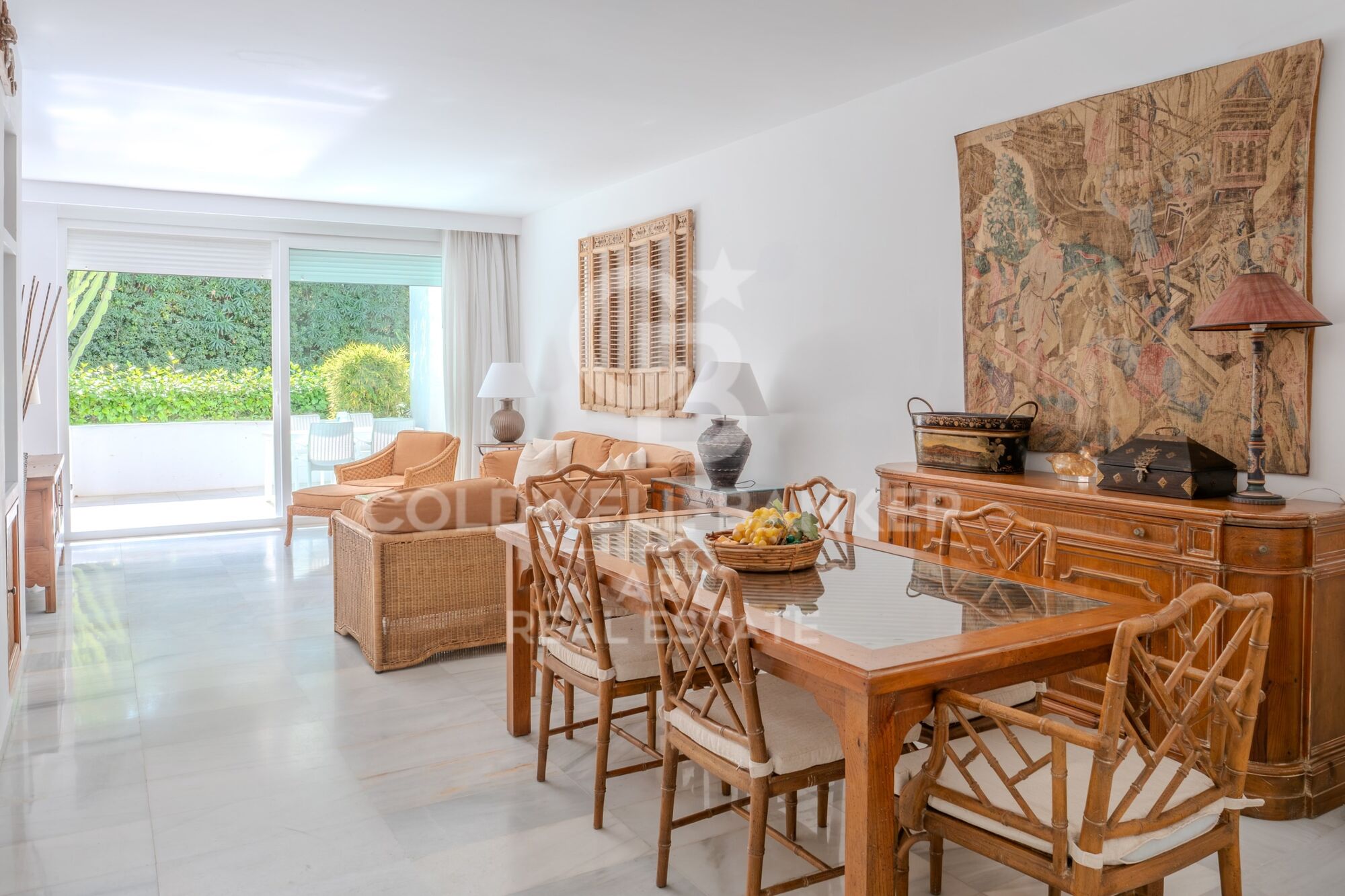 Das Apartment bietet 145 m² mit hellen und geräumigen Zimmern. Vom Eingangsbereich gelangt man in ein großes Wohn- und Esszimmer mit direktem Zugang zu einer überdachten Terrasse und dem gemeinschaftlichen Garten mit privater Nutzung, wo das Plätschern der Brunnen und des kleinen Flusses, der die Anlage durchzieht, ein Gefühl von Ruhe und Wohlbefinden vermittelt.