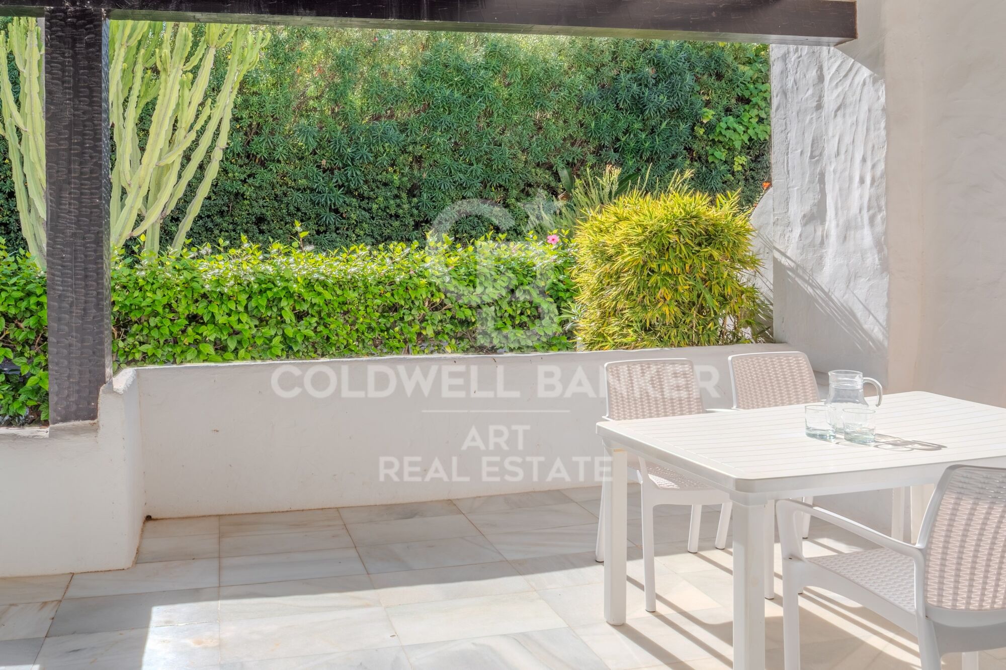 Das Apartment bietet 145 m² mit hellen und geräumigen Zimmern. Vom Eingangsbereich gelangt man in ein großes Wohn- und Esszimmer mit direktem Zugang zu einer überdachten Terrasse und dem gemeinschaftlichen Garten mit privater Nutzung, wo das Plätschern der Brunnen und des kleinen Flusses, der die Anlage durchzieht, ein Gefühl von Ruhe und Wohlbefinden vermittelt.