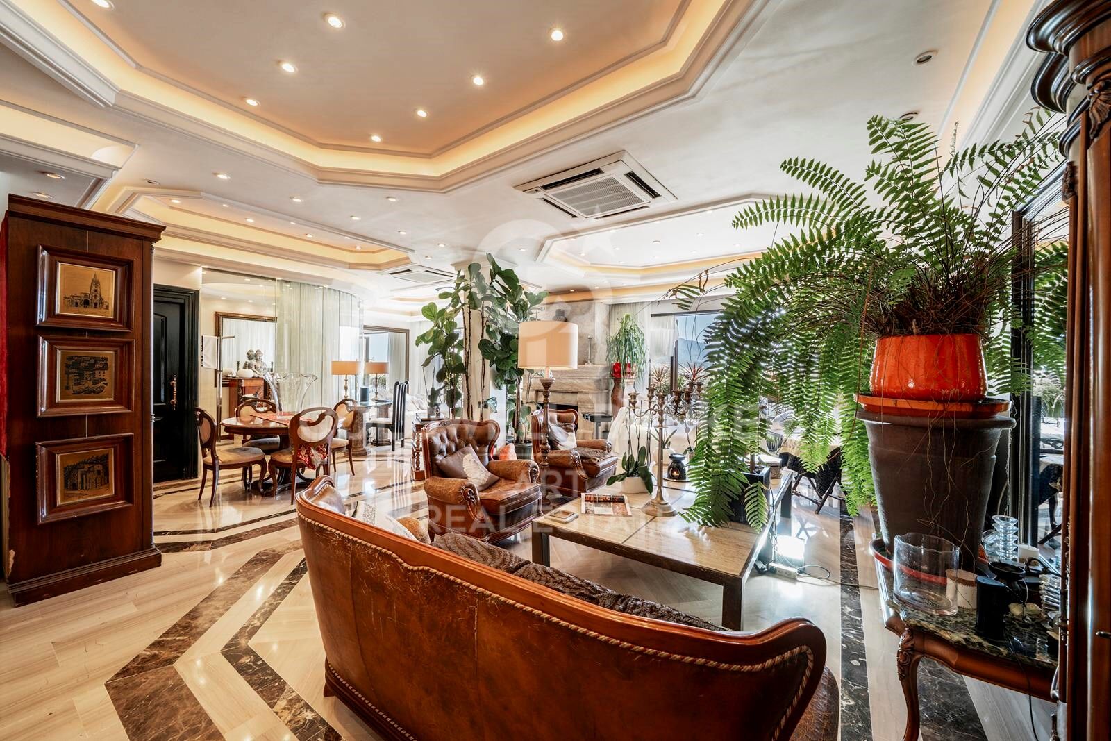Im Inneren erwartet Sie eine stilvolle Ausstattung mit hochwertigen Materialien und modernster Technik. Der Blick auf das Meer, den Hafen und den Berg La Concha öffnet sich durch großzügige Iroko-Erkerfenster mit Panzerglas. Edle italienische Marmore wie Daino Reale, Imperial und Serpellone sowie venezianische Putztechniken und drei Holzkamine aus gealtertem Daino Reale Marmor unterstreichen das exklusive Ambiente.