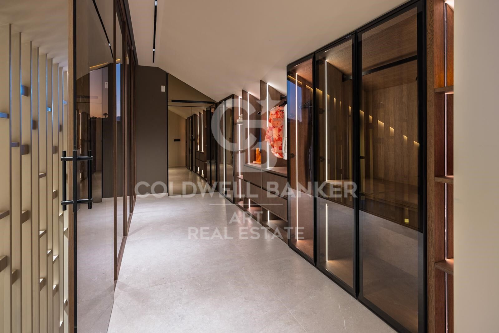 Im Inneren sorgen hohe Decken und viel Tageslicht für helle, offene Wohnbereiche, die nahtlos mit dem Außenbereich verbunden sind. Die Innenräume zeichnen sich durch klare Linien, neutrale Farbtöne und natürliche Materialien aus und schaffen eine Atmosphäre von ruhiger Eleganz. Die Villa verfügt über fünf geschmackvoll eingerichtete Schlafzimmer und sechs Badezimmer, darunter eine beeindruckende Master-Suite mit begehbarem Holzkleiderschrank und großen Fenstern mit Blick auf das Tal.
