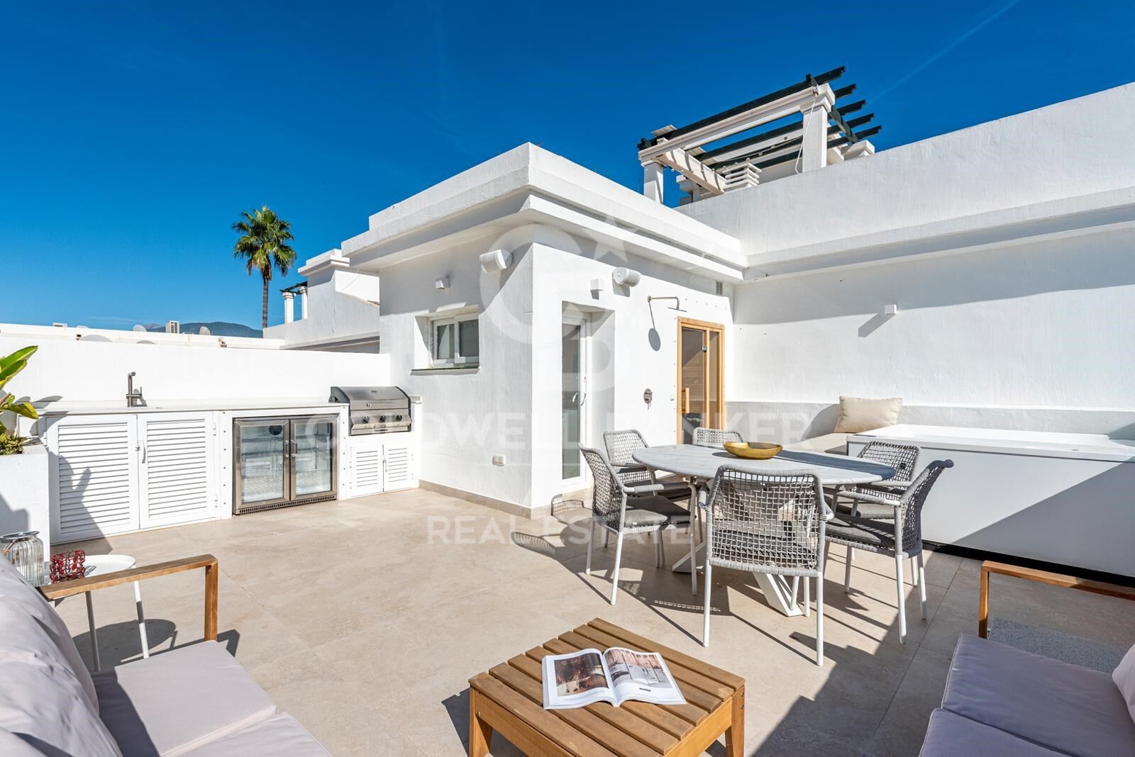 Auf der dritten Ebene dient das prächtige Dach-Solarium als Krönung des Hauses. Dieser luxuriöse Bereich bietet Jacuzzi, Sauna und eine voll ausgestattete Außenküche, alles vor dem Panorama von Nueva Andalucía und dem Mittelmeer - eine spektakuläre Kulisse für Tagesentspannung oder Abendgesellschaften.
