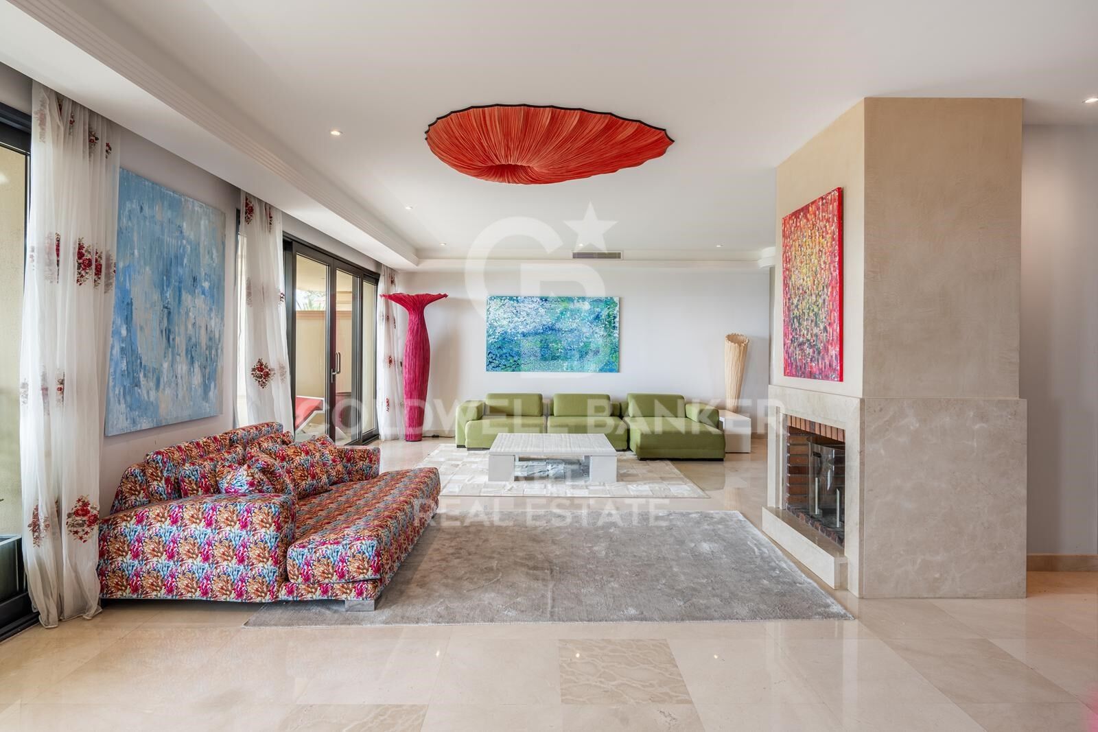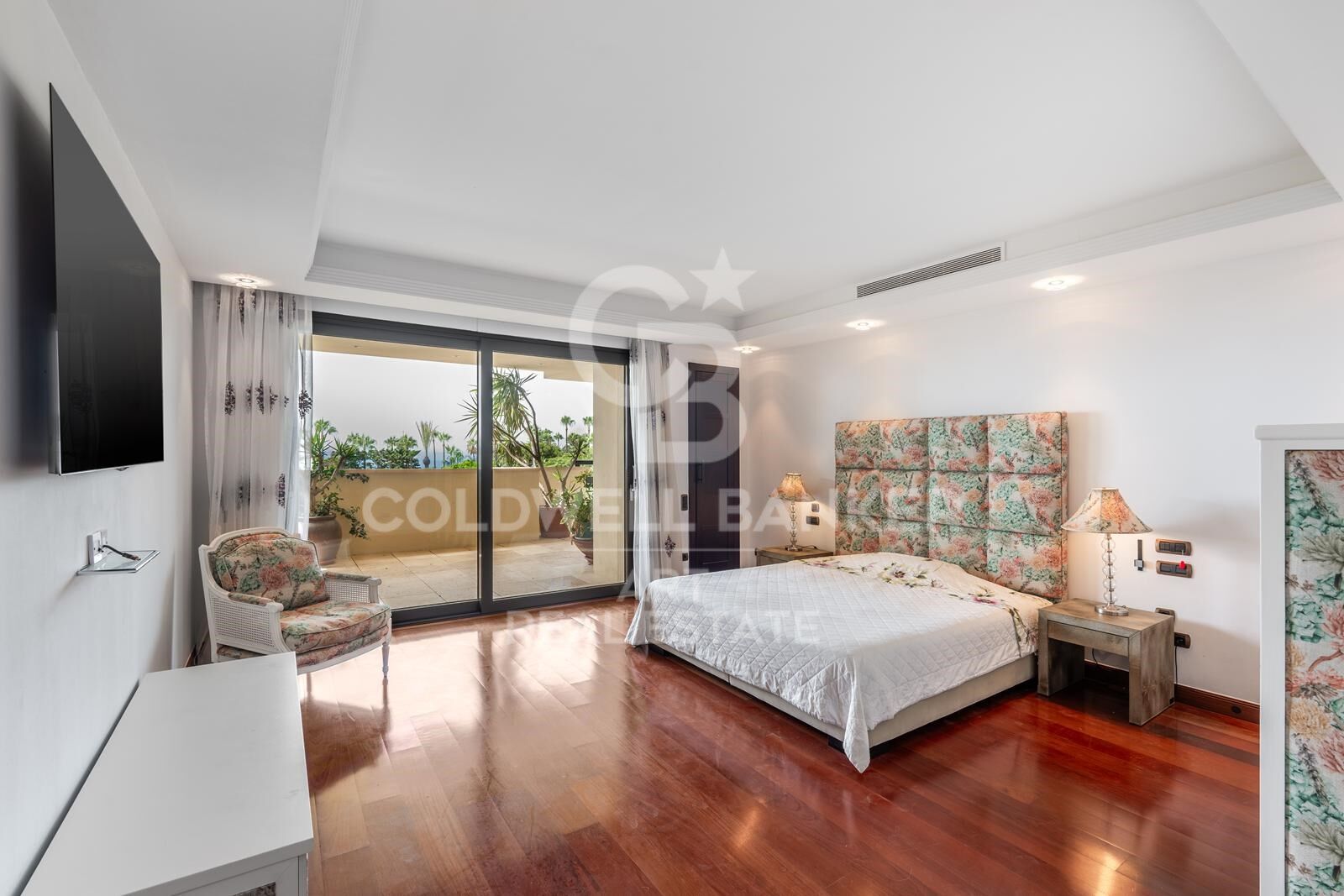 Die Wohnung umfasst drei Schlafzimmer, jeweils mit eigenem Bad en suite, sowie zwei zusätzliche Gäste-WCs. Die Hauptsuite verfügt über ein Ankleidezimmer und eine private Terrasse mit Blick auf das Mittelmeer.