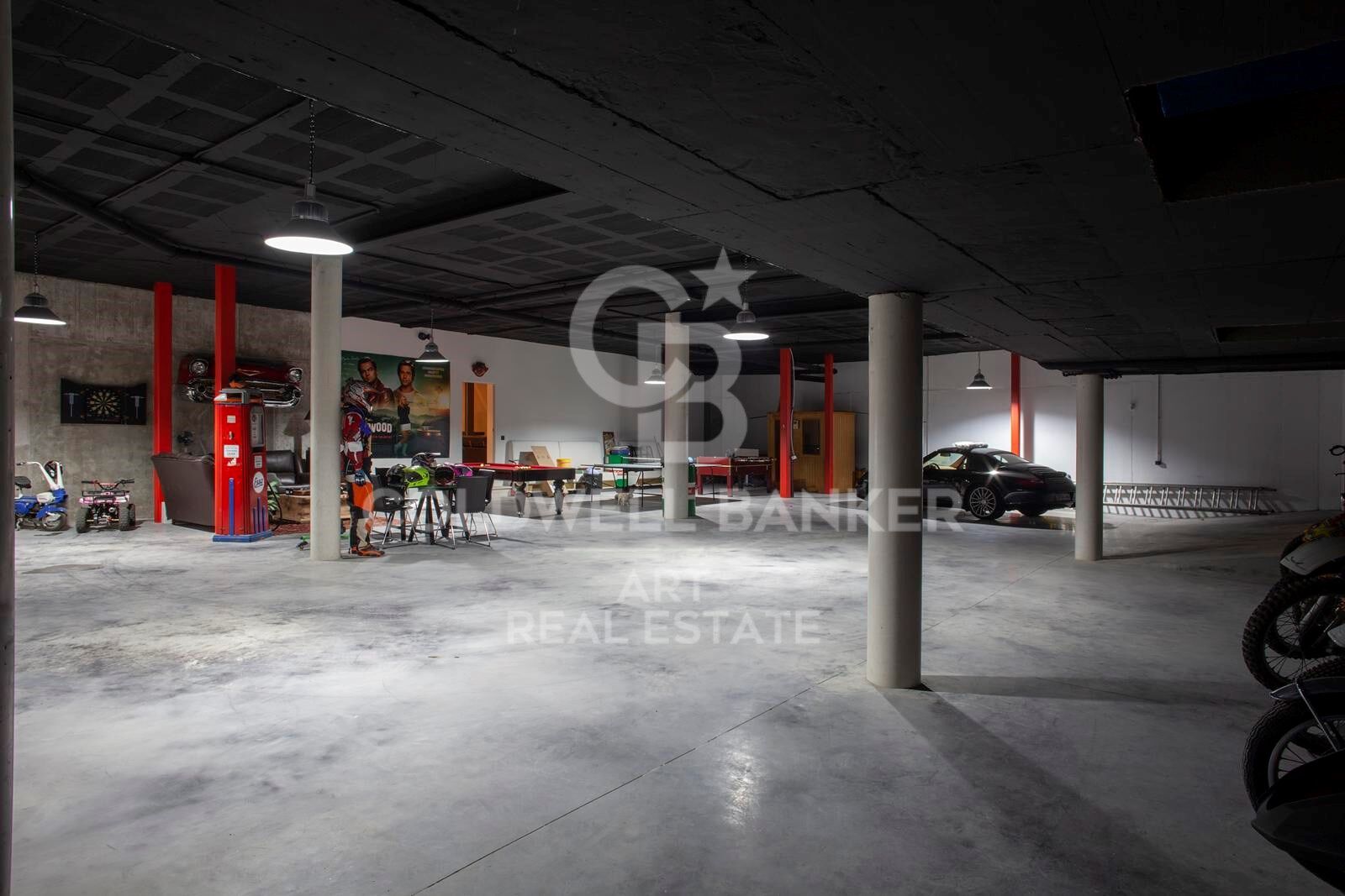Mit 7 Schlafzimmern und 6 Badezimmern verfügt eines der Schlafzimmer über zwei Innenfenster mit Blick auf die Garage im Untergeschoss. Die Villa ist mit einem Aufzug ausgestattet, der alle Etagen verbindet, sowie mit einer beeindruckenden 200 m² großen Dachterrasse mit Jacuzzi und Grillbereich. Seltene Natursteine, die aus Portugal importiert wurden, verleihen dem Anwesen einen einzigartigen Charakter. Im Außenbereich stehen Parkplätze für bis zu fünf Fahrzeuge zur Verfügung.