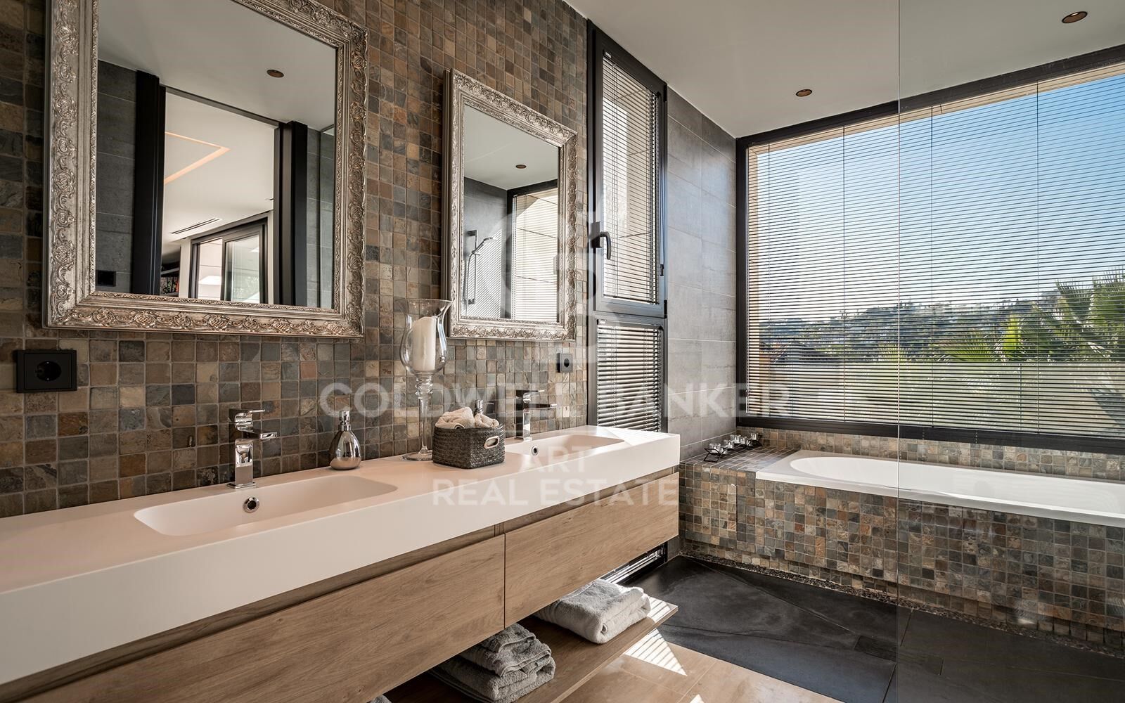 Mit 7 Schlafzimmern und 6 Badezimmern verfügt eines der Schlafzimmer über zwei Innenfenster mit Blick auf die Garage im Untergeschoss. Die Villa ist mit einem Aufzug ausgestattet, der alle Etagen verbindet, sowie mit einer beeindruckenden 200 m² großen Dachterrasse mit Jacuzzi und Grillbereich. Seltene Natursteine, die aus Portugal importiert wurden, verleihen dem Anwesen einen einzigartigen Charakter. Im Außenbereich stehen Parkplätze für bis zu fünf Fahrzeuge zur Verfügung.