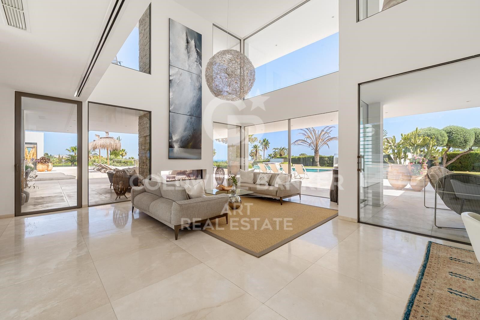 Betreten Sie das Haus und entdecken Sie großzügige Innenräume, die mit natürlichen Texturen und hochwertigen Oberflächen durchdacht gestaltet sind. Die Villa besticht durch hohe Decken, elegante Beleuchtungselemente und einen harmonischen Übergang zwischen Innen- und Außenbereichen. Die Hauptwohnräume sind geräumig und einladend, ausgestattet mit maßgefertigten Möbeln, organischen Materialien und ausgewählten Dekorelementen wie gewebter Wandkunst und handgefertigten Keramiken. Das obere Stockwerk zeigt einen ruhigen Galeriegang mit Blick auf das Hauptgeschoss und direktem Zugang zu Schlafzimmern mit weitem Ausblick und privaten Terrassen.