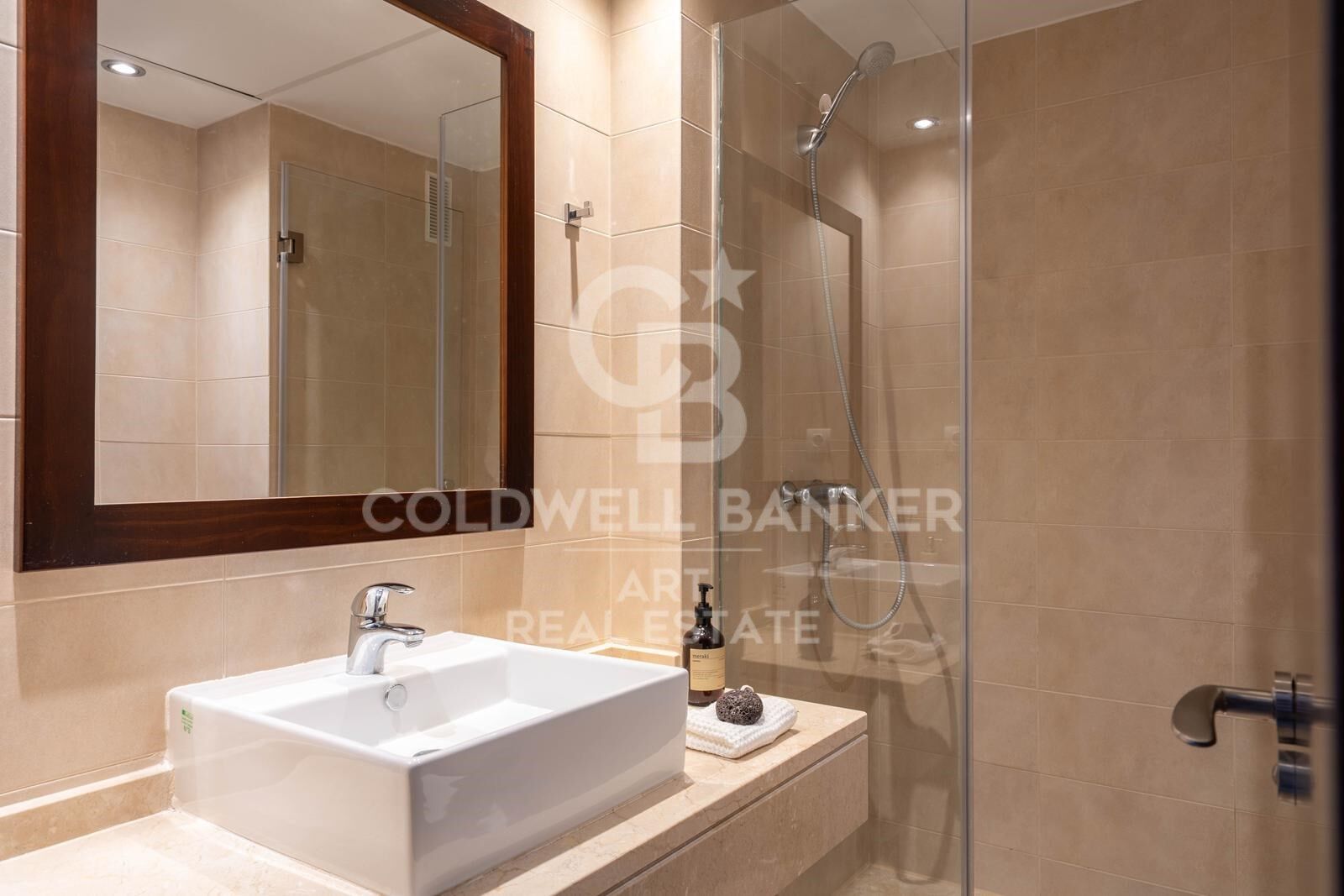 Auf zwei Ebenen verteilt bietet die Wohnung zwei großzügige Schlafzimmer, zwei moderne Bäder sowie ein Gäste-WC im Hauptgeschoss. Ein Schlafzimmer befindet sich im unteren Bereich mit direktem Zugang zur Hauptterrasse, während das Hauptschlafzimmer im Obergeschoss liegt und über eine private Terrasse mit erhöhtem Meerblick verfügtideal für den Morgenkaffee oder entspannte Sonnenuntergänge.