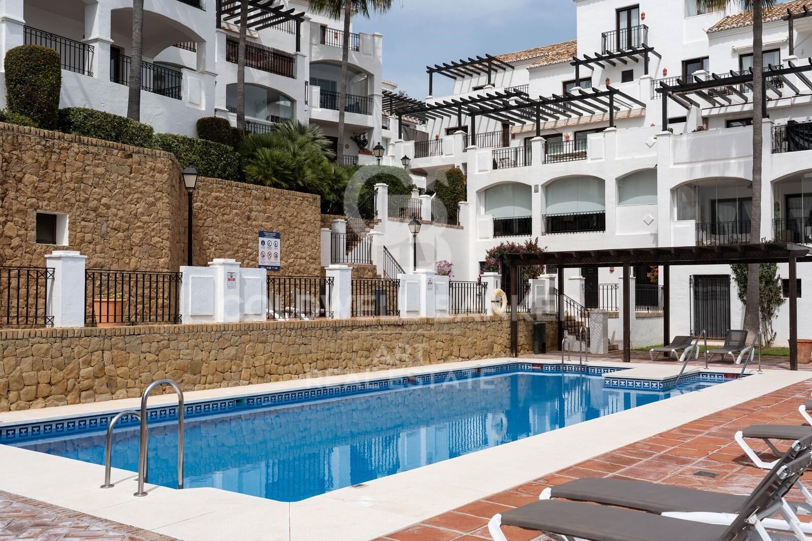 Das Apartment befindet sich in einer gesicherten Wohnanlage im traditionellen andalusischen Stil und bietet eine ruhige, authentische Atmosphäre. Die Bewohner genießen gepflegte Gärten, einen großen Gemeinschaftspool und ein naturverbundenes Umfeld, das sich wie ein ganzjähriger Rückzugsort anfühlt.
