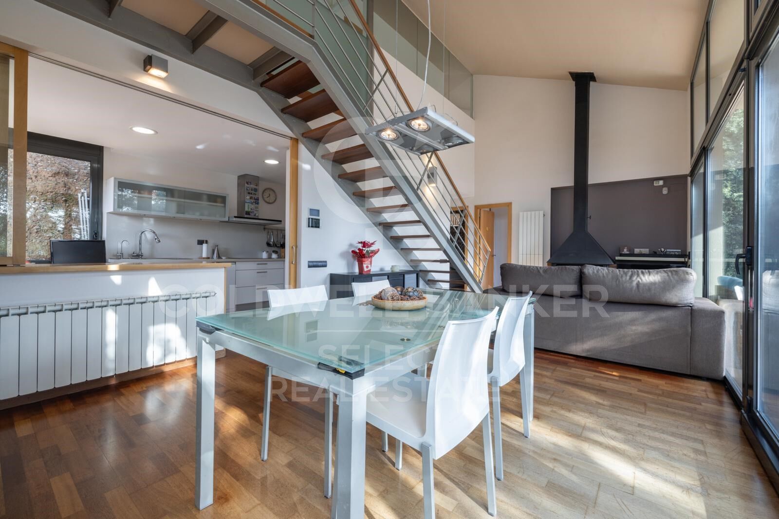 Salón con muchísima luz natural, con chimenea y acceso al porche.