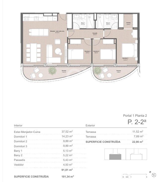 Luxuriöses Neubauprojekt in El Rengle, Mataró, nur 200m vom Meer und neben dem TecnoCampus. 38 moderne Wohnungen mit 2-4 Schlafzimmern und Blick aufs Mittelmeer. Nautisch inspirierte Fassade mit beweglichen Holzpaneelen und drehbaren Balkonen für optimale Lichtverhältnisse und Privatsphäre. CLT-Brettschichtholzbau verhindert 2,5Miokg CO-Emissionen - entspricht 530 Autos pro Jahr. Gemeinschaftsbereiche auf hohem Niveau: Infinity-Pool mit Meerblick, Fitnessstudio, Calisthenics-Zone, Garten und Kinderspielbereich. Innenräume mit warmen Holzdecken, keramischen Böden und hochwertigen minimalistischen Oberflächen. Geschätzte jährliche Rendite bis zu 5% und Wertsteigerung bis zu 25% bis 2027.