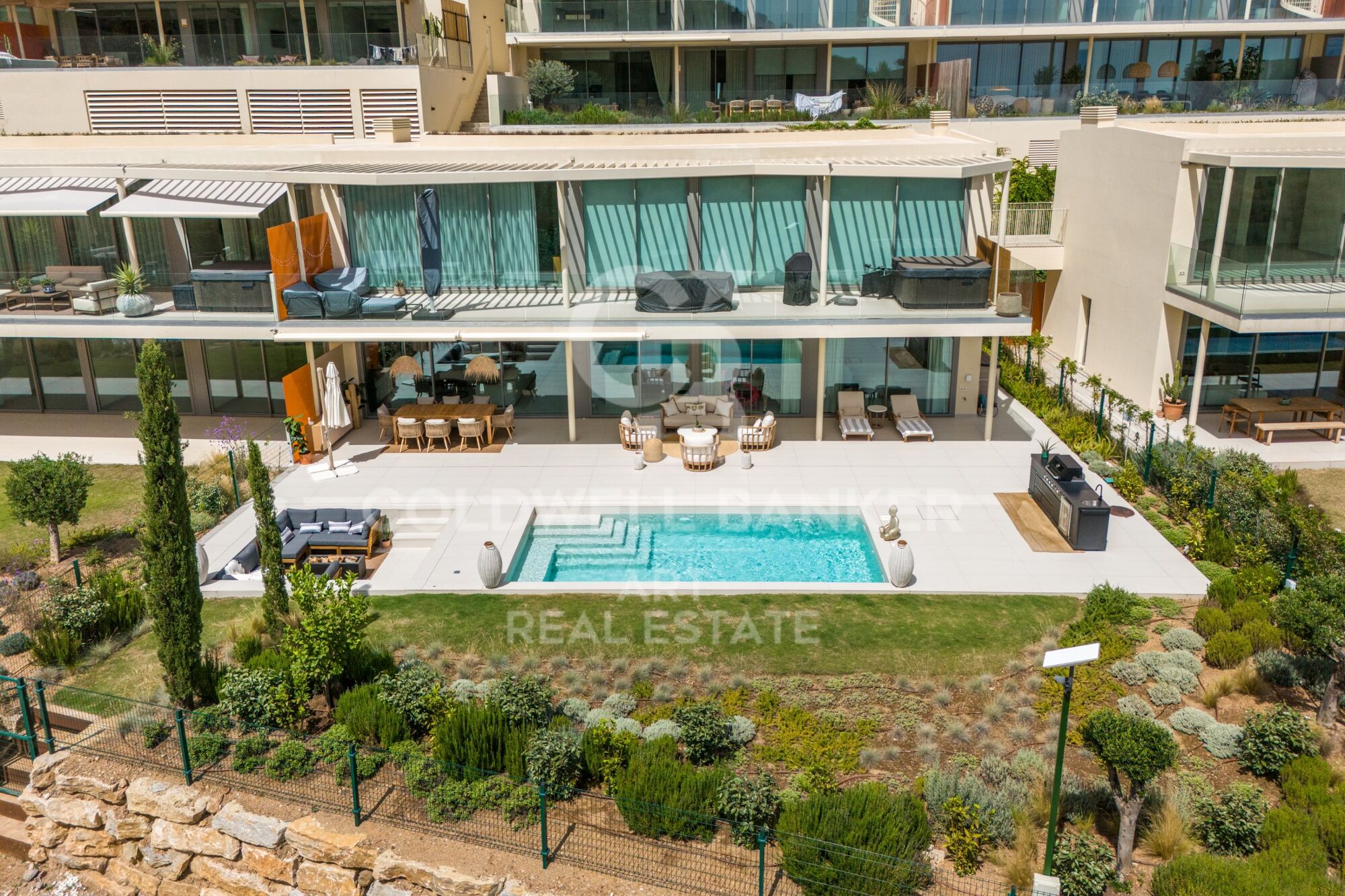 Die großzügige Terrasse ist das Herzstück des Hauses und verfügt über einen privaten Pool, einen liebevoll gestalteten Garten und eine gemütliche Feuerstelle, ideal, um ruhige Abende zu genießen. Ob beim Schwimmen im eigenen Pool, Sonnenbaden oder beim Zusammensein am Feuer mit Familie und Freunden - diese Terrasse bietet ein unvergleichliches Outdoor-Wohngefühl. Die Terrasse geht nahtlos in den geräumigen, offenen Wohnbereich über und schafft so den perfekten Rahmen für gesellige Zusammenkünfte oder ruhige Abende zu Hause.