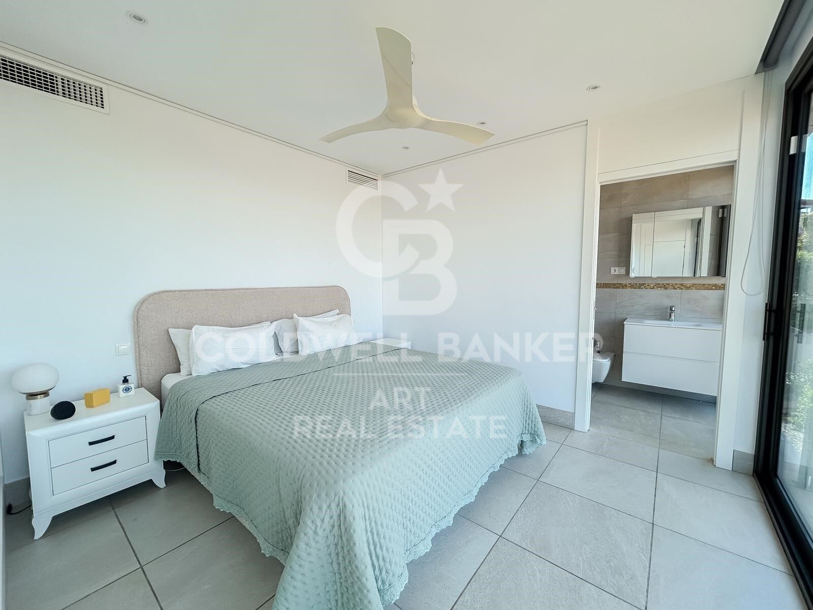 Auf der mittleren Etage, auf der Eingangsebene, bietet die Villa eine überdachte Garage für zwei Fahrzeuge, vier komfortable Schlafzimmer und drei Badezimmer, von denen sich zwei ein Badezimmer teilen. Darüber hinaus gibt es einen Maschinenraum, der als Waschküche dient, und eine Terrasse mit direktem Zugang von den zweiten Schlafzimmern, die alle so konzipiert sind, dass sie im Alltag maximalen Komfort bieten.