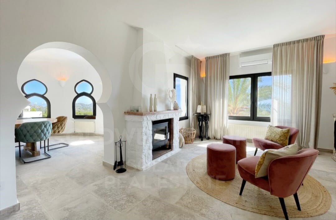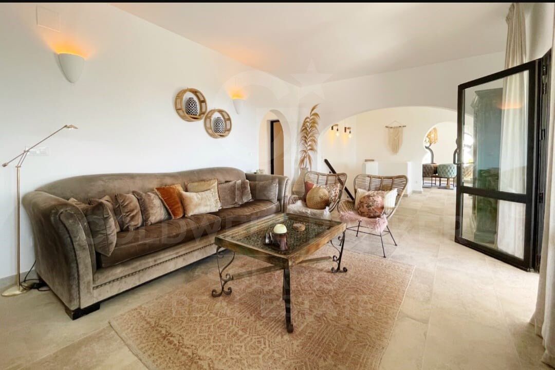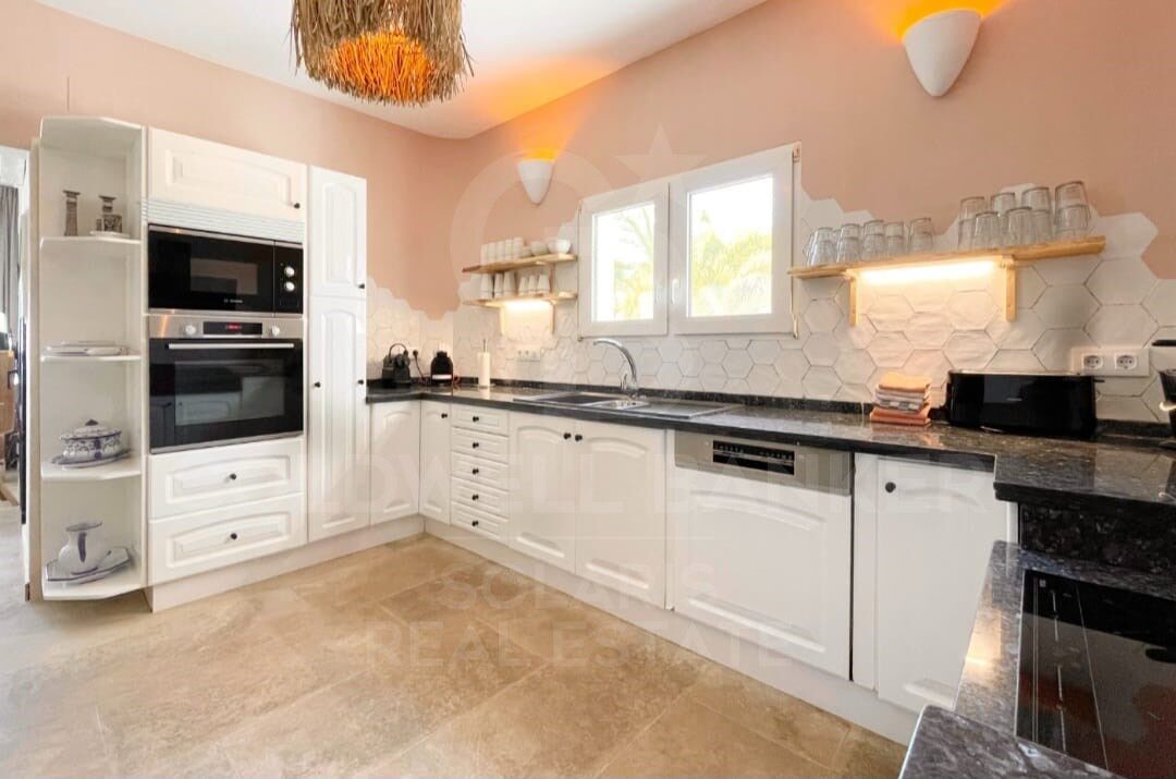 Beim Betreten des Grundstücks öffnet sich ein geräumiges und helles Wohnzimmer zum Naya, das die Wohn- und Essbereiche elegant integriert und durch einen Kamin bereichert wird, der Wärme spendet. Die fließende Verbindung zur Außenterrasse, ausgestattet mit einer Sommerküche, lädt dazu ein, einzigartige Momente im Freien in einer privilegierten Umgebung zu genießen. Die moderne und voll ausgestattete Küche integriert sich perfekt in diesen Raum.