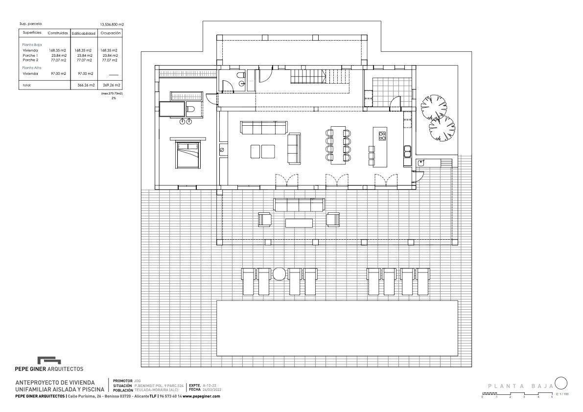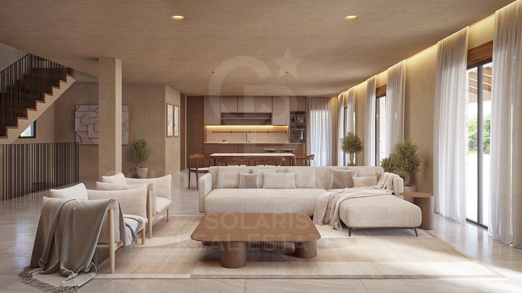 En la planta principal se sitúa un amplio salón-comedor con cocina integrada en concepto abierto. La cocina está completamente equipada y cuenta con una isla central, lo que aporta funcionalidad y un toque moderno al espacio ideal para quienes disfrutan cocinando o recibiendo visitas. Gracias a sus grandes ventanales, el interior recibe abundante luz natural y se conecta directamente con la terraza exterior y la zona de la piscina, integrando perfectamente el interior con el exterior.