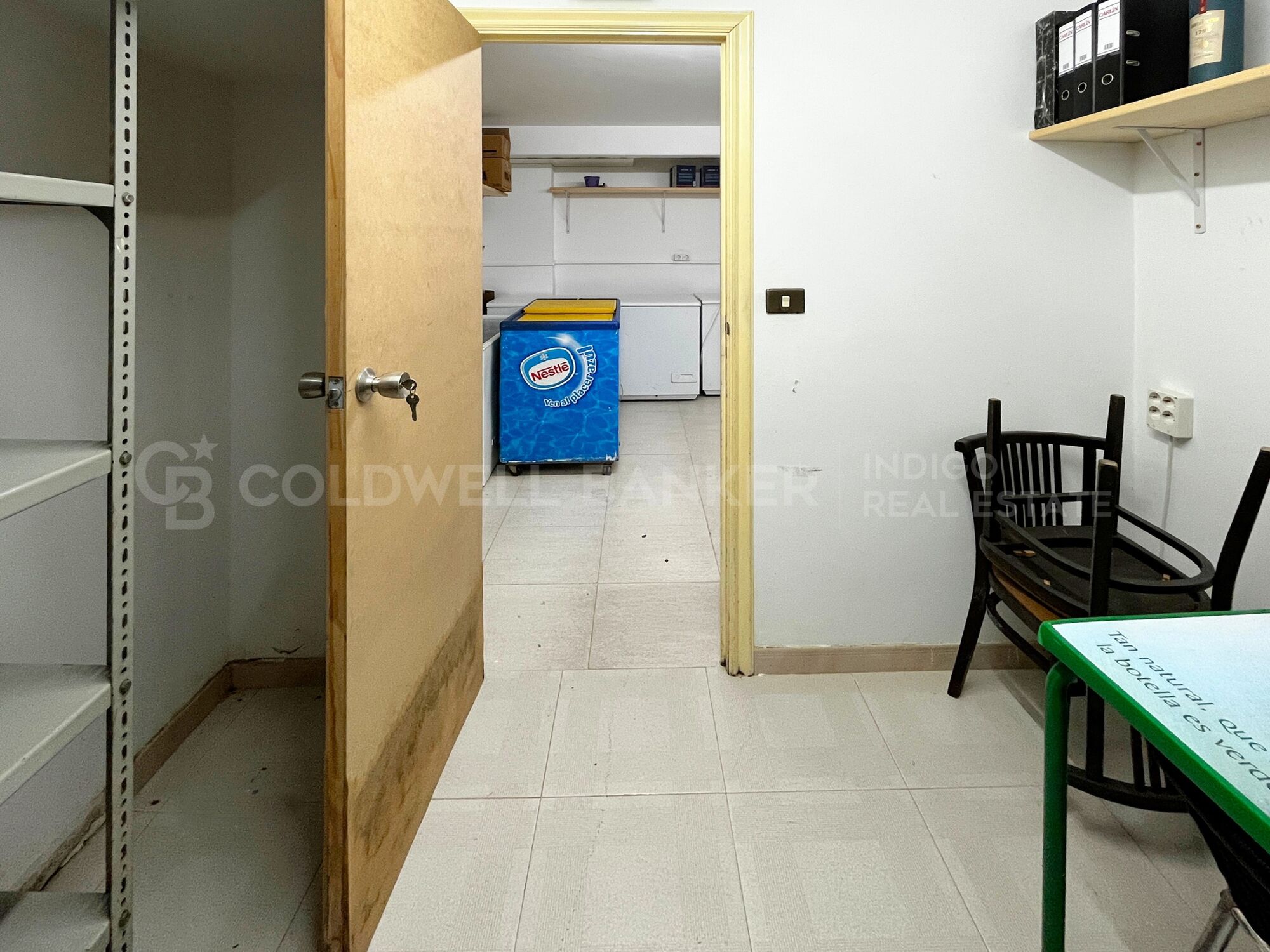 Distribución profesional: cocina, almacén, oficina, aseos y vestuarios de personal.