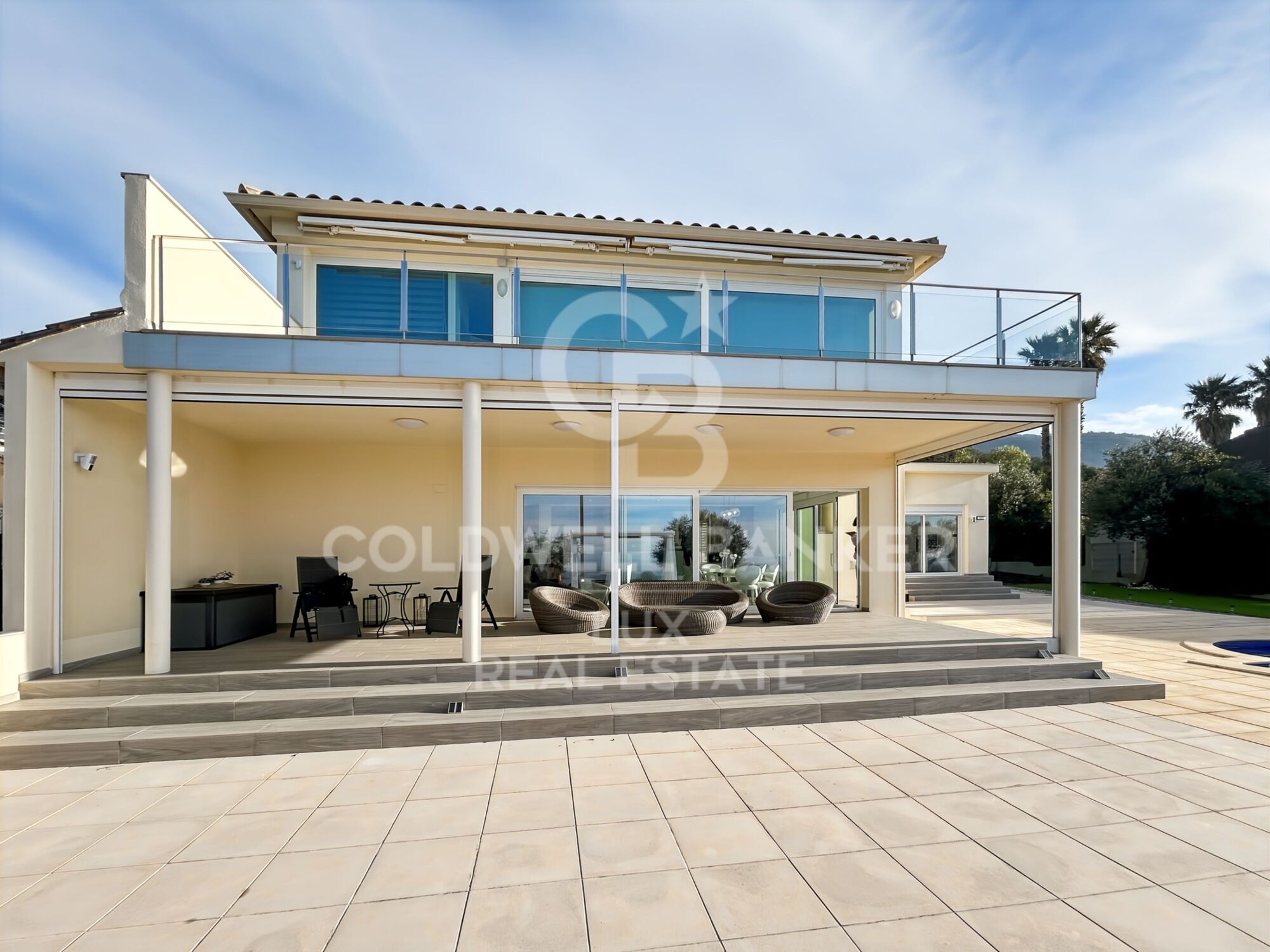 Das Obergeschoss ist einer sehr großzügigen Master-Suite gewidmet. Privater Salon mit Zugang zu einer Terrasse mit offenem Blick auf das Meer, die Berge und die Landschaft, geschützt durch eine elektrische Markise. Schlafzimmer mit Badezimmer inklusive Whirlpool, Dusche und WC. Geräumiges Ankleidezimmer. Ein zusätzlicher Bereich, derzeit als Abstellraum genutzt, ermöglicht den zukünftigen Einbau eines Aufzugs.