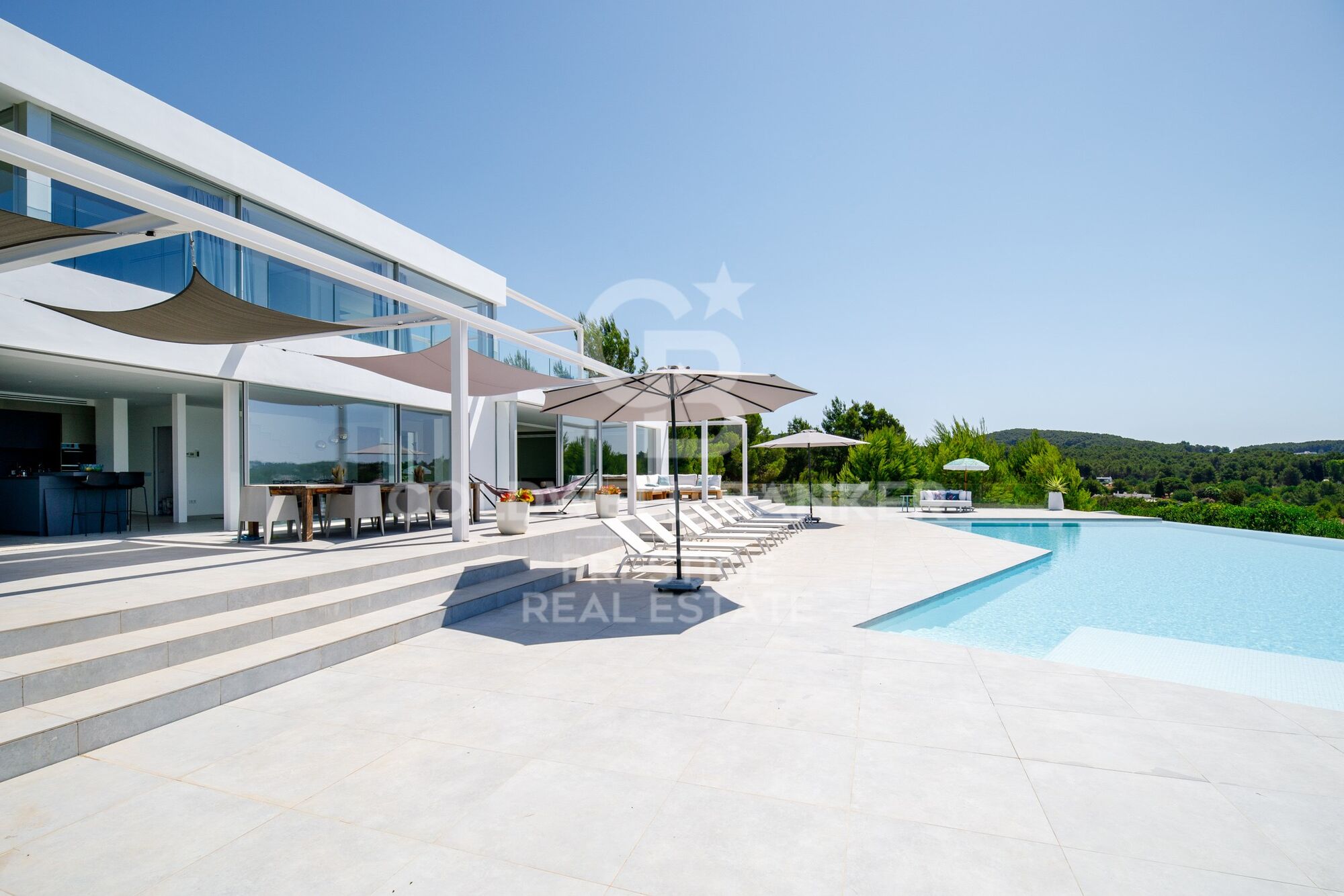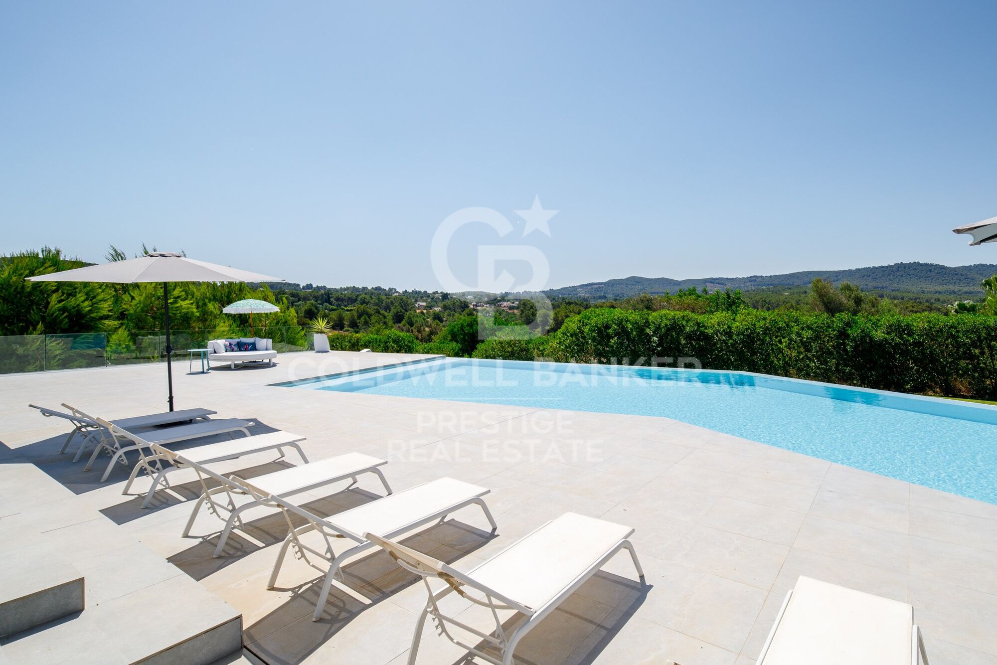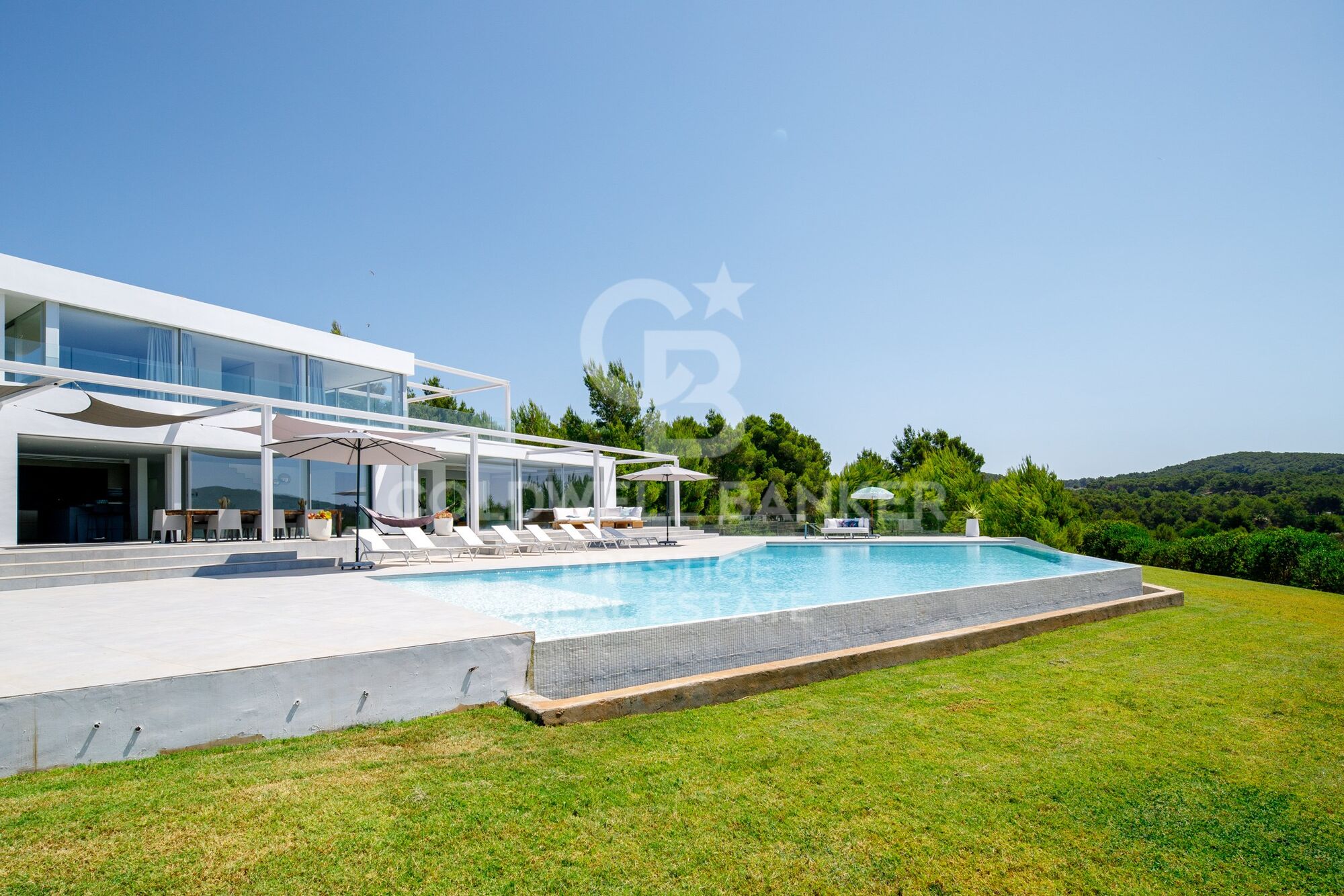 Una gran parte de la propiedad está cubierta de pinos y vegetación típica de Ibiza. La zona de entrada de la propiedad, así como la zona directamente junto a la casa, está ajardinada. La piscina de aproximadamente 125 m2, con un diseño extravagante, ofrece mucho espacio para refrescarse y jugar en los calurosos días de verano. Hay un gran césped delante de la piscina y al lado de la casa. La terraza de sol frente a la casa puede ser sombreada con toldos.