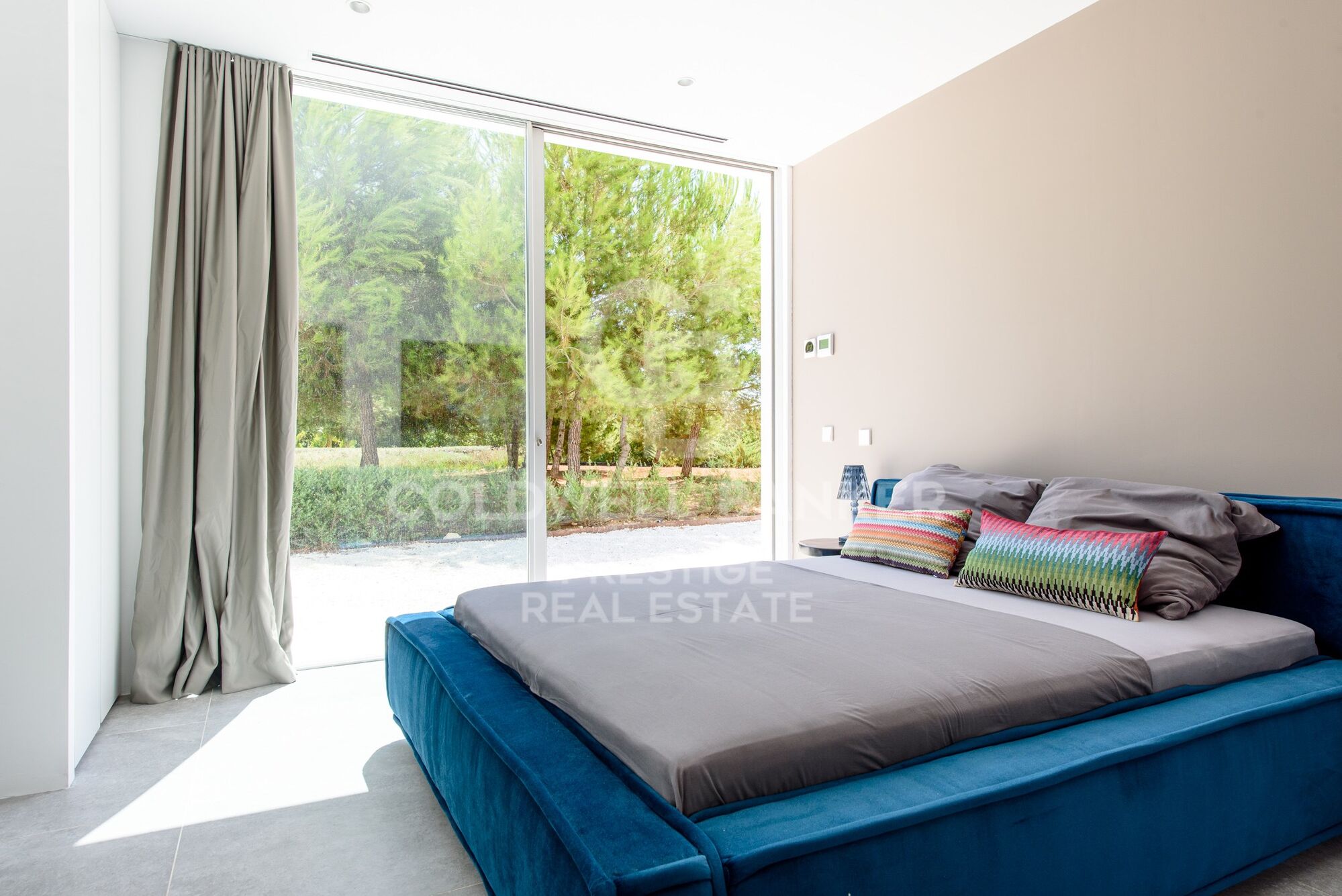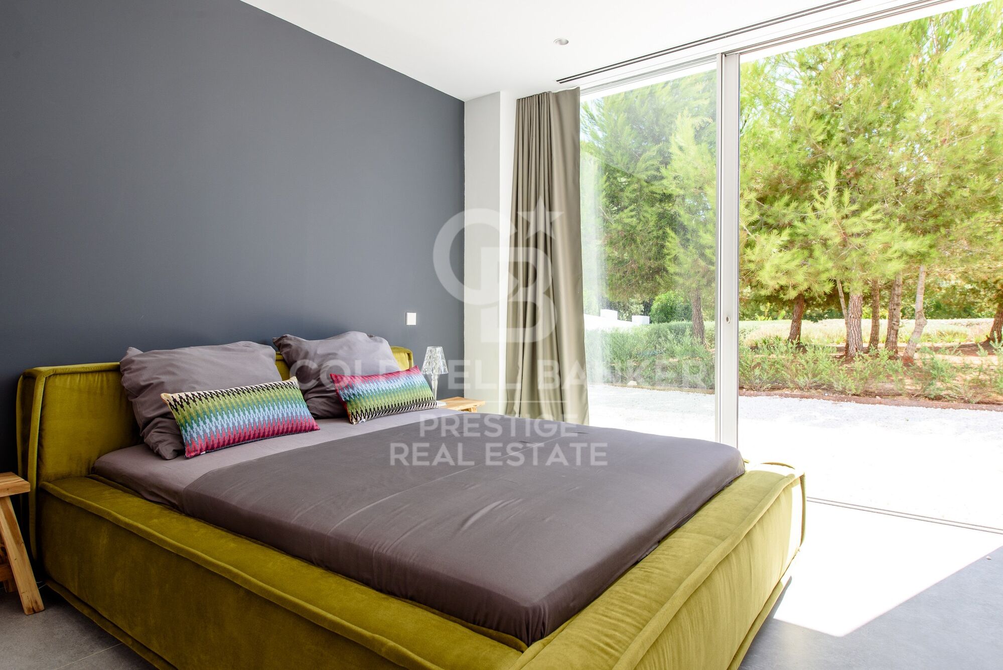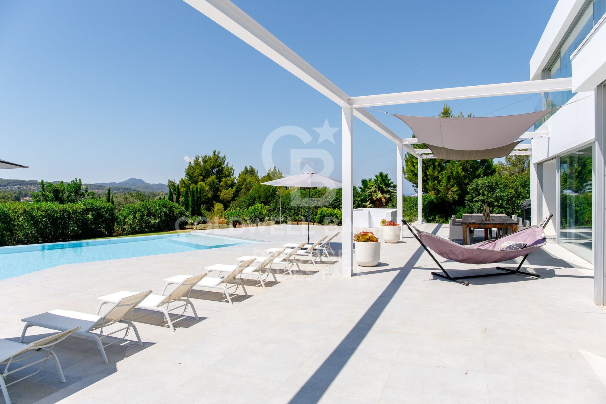 Una gran parte de la propiedad está cubierta de pinos y vegetación típica de Ibiza. La zona de entrada de la propiedad, así como la zona directamente junto a la casa, está ajardinada. La piscina de aproximadamente 125 m2, con un diseño extravagante, ofrece mucho espacio para refrescarse y jugar en los calurosos días de verano. Hay un gran césped delante de la piscina y al lado de la casa. La terraza de sol frente a la casa puede ser sombreada con toldos.