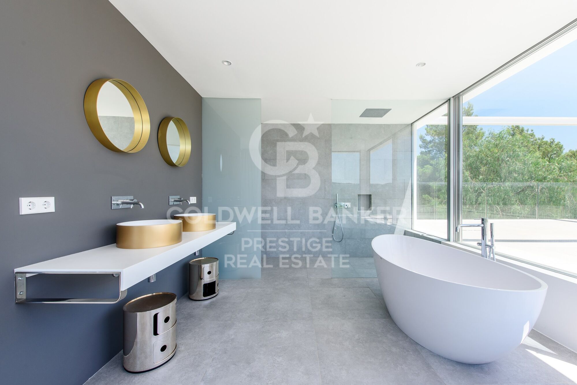 La planta baja, con unos 270 m2 de superficie habitable, se divide en un amplio y luminoso salón con rincón de sofás, zona de comedor y cocina abierta totalmente equipada. Frente a la zona de estar hay una amplia terraza con pérgola y acceso a la piscina privada. En la parte norte de la planta baja hay tres dormitorios dobles, con baños en suite, así como un aseo de invitados y un trastero.