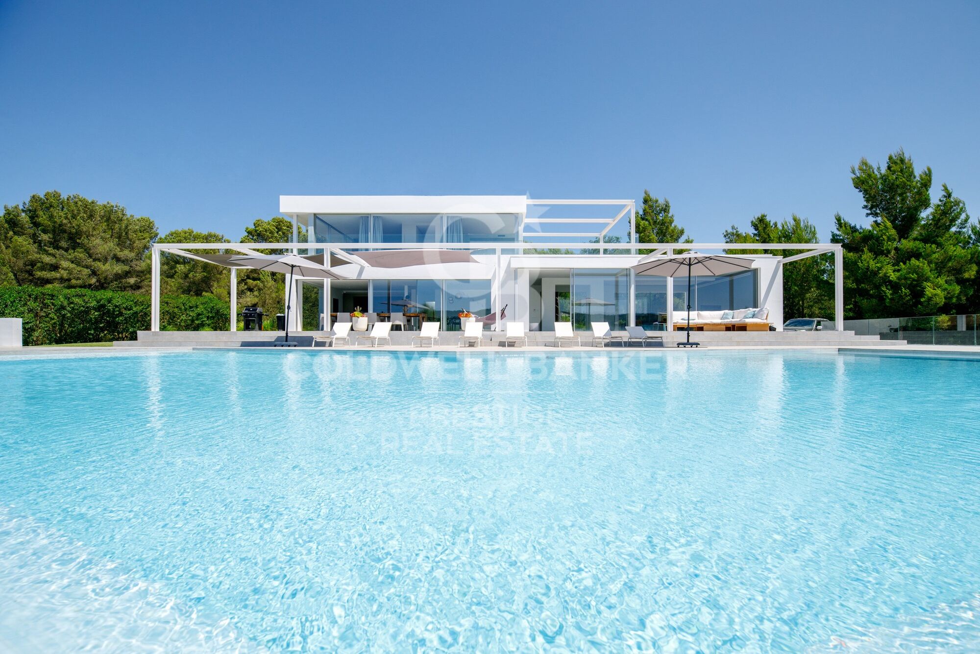 Una gran parte de la propiedad está cubierta de pinos y vegetación típica de Ibiza. La zona de entrada de la propiedad, así como la zona directamente junto a la casa, está ajardinada. La piscina de aproximadamente 125 m2, con un diseño extravagante, ofrece mucho espacio para refrescarse y jugar en los calurosos días de verano. Hay un gran césped delante de la piscina y al lado de la casa. La terraza de sol frente a la casa puede ser sombreada con toldos.