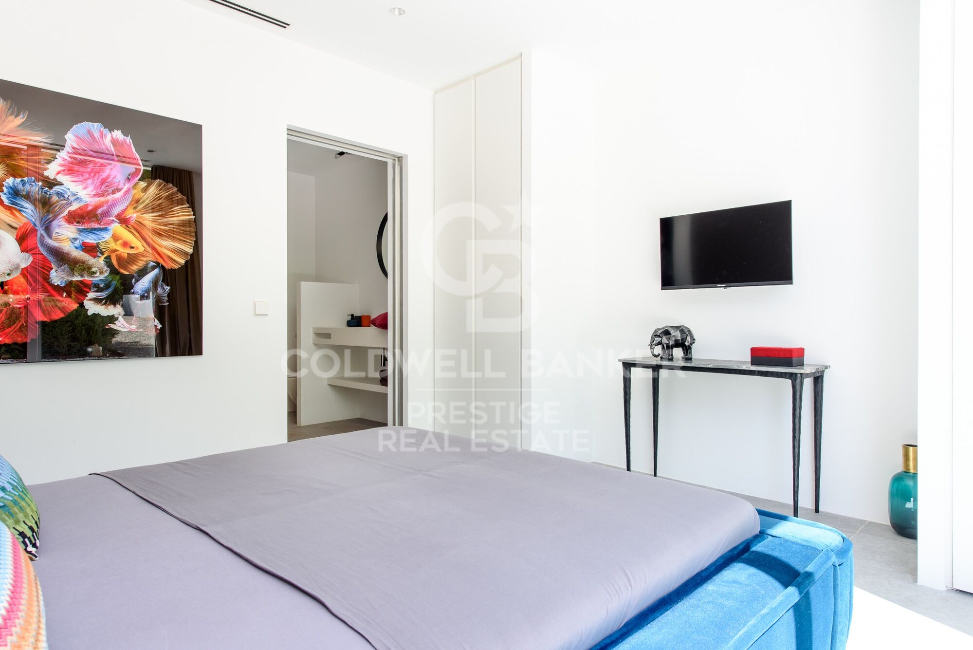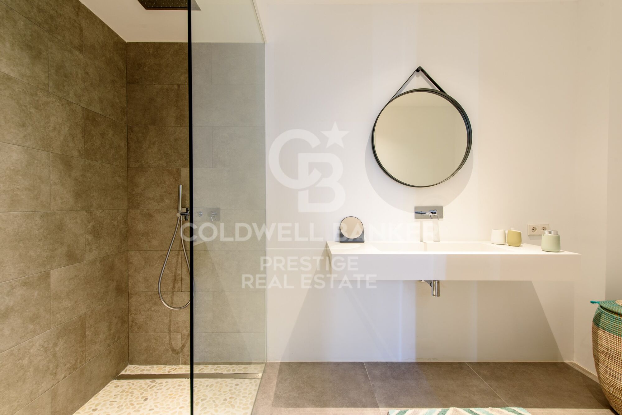 La planta baja, con unos 270 m2 de superficie habitable, se divide en un amplio y luminoso salón con rincón de sofás, zona de comedor y cocina abierta totalmente equipada. Frente a la zona de estar hay una amplia terraza con pérgola y acceso a la piscina privada. En la parte norte de la planta baja hay tres dormitorios dobles, con baños en suite, así como un aseo de invitados y un trastero.