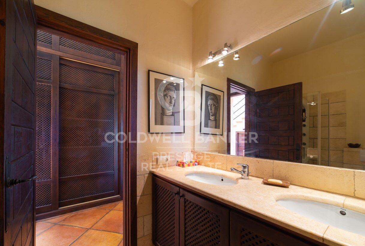 Das Haupthaus mit insgesamt 325 m2 verteilt sich auf zwei Etagen. Im Erdgeschoss (200,87 m2) befindet sich ein großes offenes Wohnzimmer mit Kamin, ein Essbereich, eine separate Küche mit zusätzlichem Abstellraum. Darüber hinaus befinden sich auf dieser Etage ein Gästeschlafzimmer mit eigenem Bad, ein Gäste-WC und ein großes Schlafzimmer. Der überdachte Patio am Eingang verbindet das Büro, den Wohnbereich und die Schlafzimmer im Obergeschoss. Das Glasdach ist motorisiert und kann bei Bedarf geöffnet werden. Wenn Sie über die Innentreppe im Obergeschoss (123,13 m2) ankommen, finden Sie das Hauptschlafzimmer, sehr geräumig, mit Ankleideraum, eigenem Bad und einer großen Terrasse mit