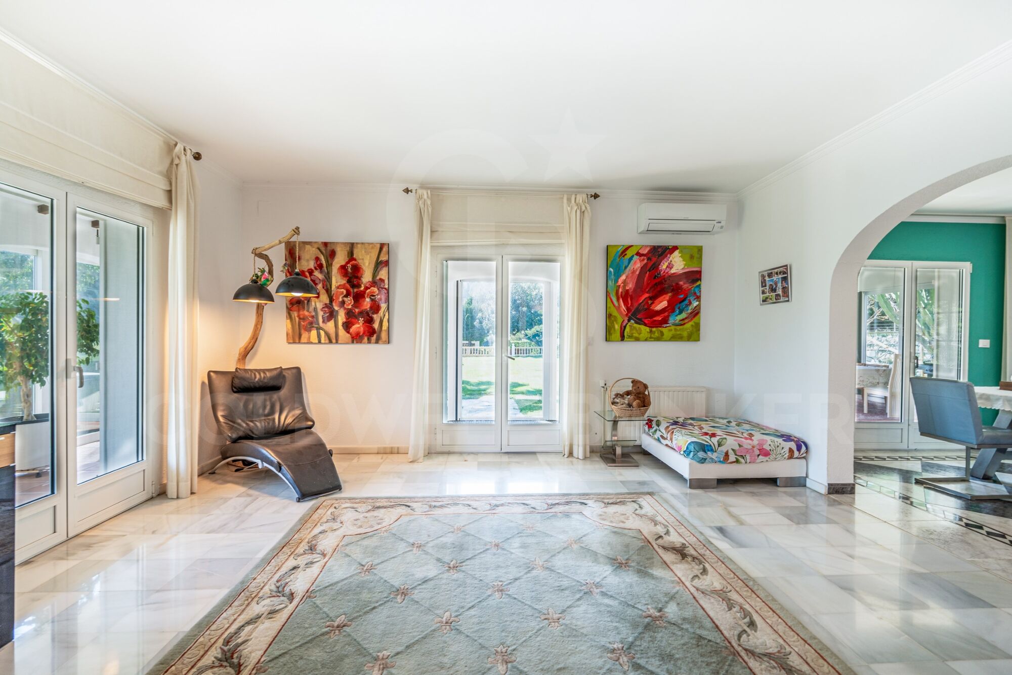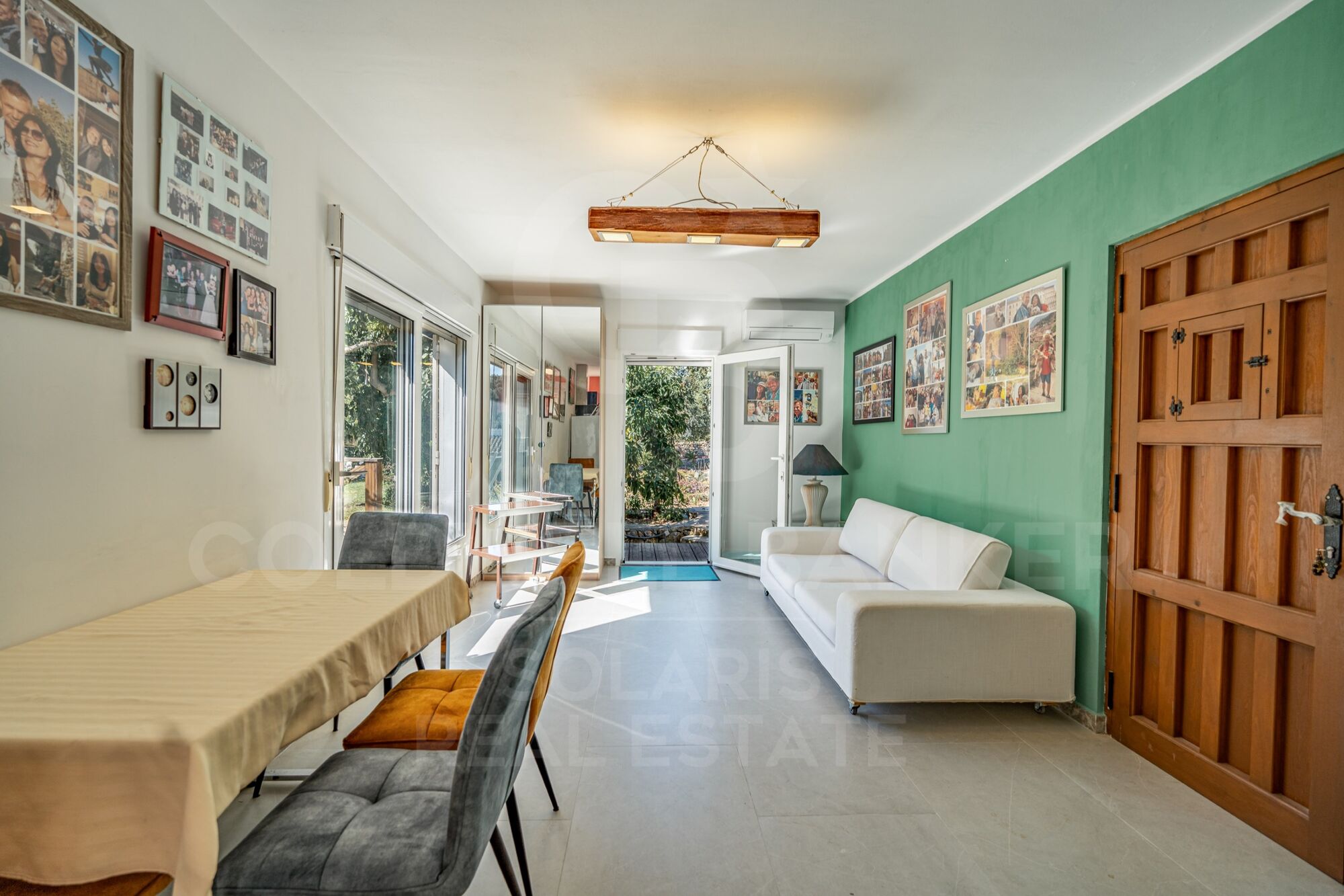 En la planta baja, tres dormitorios adicionales y dos baños completan la zona de descanso, ofreciendo comodidad tanto para la familia como para invitados. El corazón de la vivienda lo ocupa un amplio salón-comedor de concepto abierto, presidido por una elegante chimenea que aporta calidez y personalidad. Este espacio conecta con una magnífica terraza acristalada con cortinas de cristal, ideal para disfrutar durante todo el año, adaptándose perfectamente a cada estación.