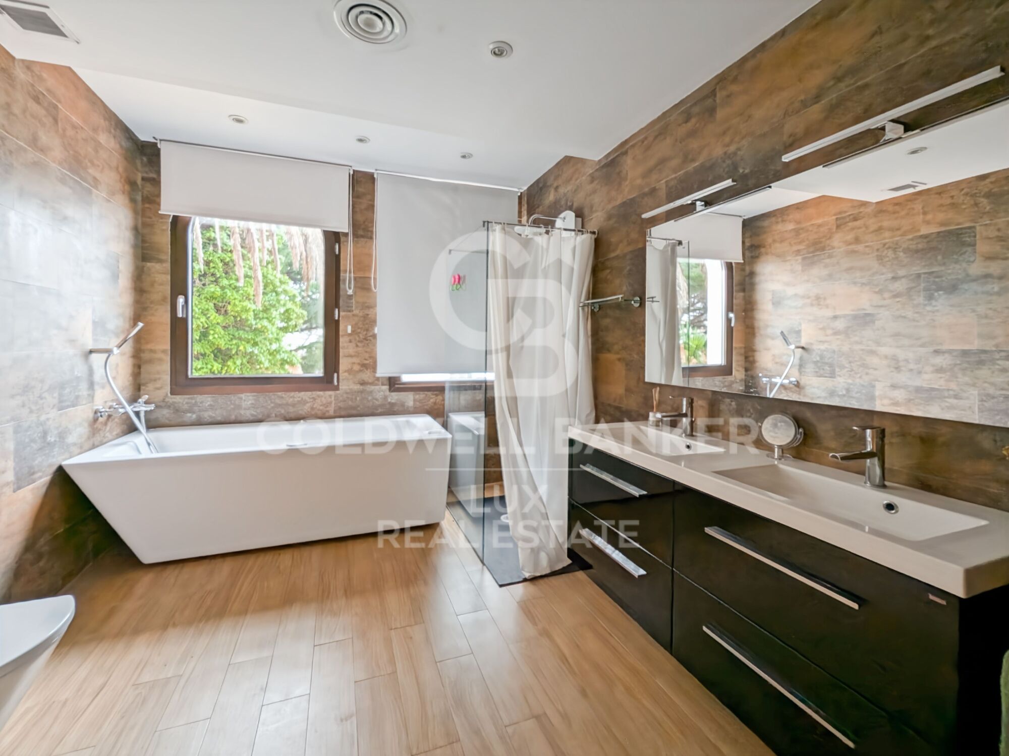 El interior cuenta con una generosa zona de estar con varias zonas, dos salones, un comedor y una cocina totalmente equipada. En la zona noche, hay cinco amplios dormitorios, incluida una suite principal con vestidor doble y cuarto de baño.