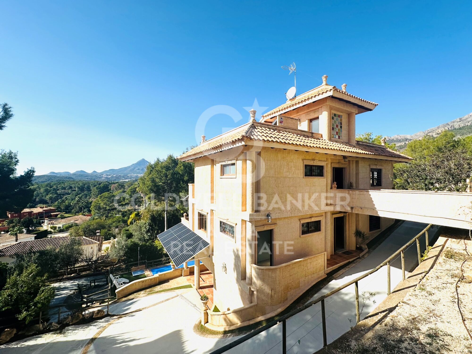 Esta elegante villa, situada en una zona tranquila y residencial de Altea la Vella, ofrece espectaculares vistas abiertas al mar y a las montañas. Con una arquitectura moderna, amplios espacios interiores y una excelente orientación sur, es el lugar perfecto para disfrutar del clima mediterráneo durante todo el año. Distribución Panta baja: Amplio salón-comedor con grandes ventanales y acceso directo a la soleada terraza con piscina privada y zona chill-out. Moderna cocina americana totalmente equipada. Aseo de invitados. Dormitorio principal con baño en suite, vestidor y salida a la terraza. Primera planta: Hall de entrada luminoso. Dos dormitorios dobles, armarios empotrados y ambos con acceso a una terraza con vistas al mar. Un baño completo. Garaje cerrado con espacio adicional de almacenamiento. Características principales Casa/chalet independiente de 2 plantas. 255 m² construidos en una parcela de 1.669 m². 3 dormitorios, 2 baños y 1 aseo. Amplias terrazas y balcón con vistas al mar. Piscina privada - zonas exteriores ajardinadas- zona chill-out -+ Bbq. Garaje cerrado incluido en el precio. Propiedad en muy buen estado. Armarios empotrados y trastero. Orientación sur, muy soleada. Calefacción central de gas. Esta propiedad está situada en una zona muy tranquila y bien comunicada de Altea la Vella, a pocos minutos de todos los servicios, combina confort, privacidad y unas vistas inmejorables, ideal como residencia permanente o casa de vacaciones en la Costa Blanca. #ref:CBSA728