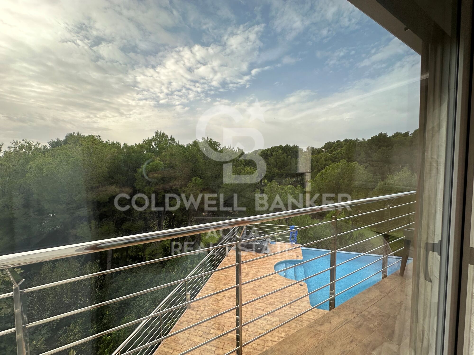 COLDWELL BANKER is pleased to present this magnificent villa, on a plot of 10.000m2, which will allow you to isolate yourself in a natural environment, in Bellaterra, just 20 minutes from Barcelona. Surrounded by palm trees and tropical vegetation, presided over by an impressive swimming pool, you will find this beautiful house equipped with all the comforts, with large open and luminous spaces. It is 635m2 between the house, the guest house and the entire sports area, with south-east orientation. The house cannot be seen from the street from any angle and this makes it particularly private. We enter the property along a path surrounded by vegetation on both sides until we discover the house in the background. We unload in the large parking area and from there, parallel to the swimming pool, we reach the entrance to the house. Inside, we are directly welcomed by a spacious and cosy living room with fireplace and dining room. Two large windows let in all the light and allow us to see the swimming pool and the lush vegetation of the garden. This large space can accommodate several additional reading or music rooms as it is very spacious. At the back of the house is the fully equipped kitchen/diner. On this floor we also have the large master bedroom with en suite bathroom. Downstairs there are two double bedrooms with en-suite bathrooms and a third bedroom assisted by another bathroom. There is also a beautiful wine cellar with vaulted ceiling and a laundry room. The garden area has a very large swimming pool, a solarium area with spectacular views of the horizon and a barbecue area. This last area houses the guest villa with a double bedroom and a bathroom. Finally we discover a magnificent blue tennis court. We can lose ourselves in various landscaped paths or go into the woods that the property has, always surrounded by the strictest privacy. DESCRIPTION OF THE LOCATION: Bellaterra is located in an elevated and sunny area, between the towns of Sant Cugat, Sabadell, Sant Quirze and Cerdanyola. True to its origins, it has established itself as a residential area par excellence, with a very familiar population resident all year round. Separated from the Collserola mountain range, Bellaterra faces the sea to the south-east and the Montseny to the north-east. Its strategic enclave places it 12 minutes from Barcelona on the C-58 and 20 minutes from the AP-7 and the B-30. This connectivity allows access to all desirable services. In less than 5 minutes we are in the reference hospitals, Universities (UAB, UIC and ESADE), the most prestigious international schools (Agora, Europa School International, Japanese School, Viaró, La Vall), Shopping Centres (IKEA; Corte Inglés, Cinemas), industrial estates (Can Sant Joan, ...) and outstanding sports centres. It has the typical services of a small town such as a pharmacy, bank office, church, restaurants, sports club, hairdresser, pet shop, petrol stations, among others. In addition to 2 railway stations of the Generalitat. Everything you need to live in a natural environment without renouncing to the immediate connection with the cities that surround it. #ref:CBSC121