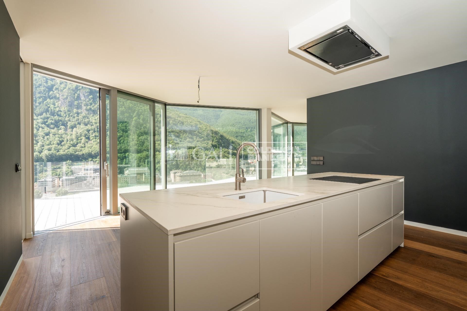 Exclusive new development located just 500 meters from the center of Andorra la Vella and its main shopping street.~~The 14-story building is scheduled for completion in December 2027 and will offer a modern, comfortable, and functional environment with landscaped gardens and a paddle tennis court.~~The apartments are characterized by their contemporary design, A-rated energy efficiency, and the use of premium materials.~~All units feature outdoor space with practical balconies or terraces, and a carefully considered orientation that guarantees natural light and thermal comfort year-round.~~Key Features~Structure and Façade: Prefabricated concrete system and ventilated façade with ceramic cladding that mimics concrete and engineered wood, providing elegance and durability.~Exterior Joinery: Aluminum or PVC with thermal break and triple glazing, guaranteeing optimal thermal and acoustic insulation.~Climate Control: Radiant floor heating and cooling system with domestic hot water production via the FEDA Ecoterm network, ensuring maximum efficiency and comfort. Home automation: pre-installation for scalable home automation and motorized blackout curtains in the living room.~LED lighting in kitchens, bathrooms, and common areas.~Pre-installation for electric vehicle charging in parking spaces.~~Interior finishes: Grato SPC laminate flooring and non-slip porcelain stoneware on balconies and terraces.~Fully equipped kitchens with MOBALPA or similar cabinetry, CERATOP or similar countertops, and SIEMENS or equivalent appliances.~Bathrooms with wall-hung vanities, thermostatic faucets, and resin shower tray with screen.~Armored front door and lacquered interior doors.~~Sustainability and efficiency: Thanks to its construction design, advanced insulation, and state-of-the-art energy systems, the development achieves the highest energy rating, A, reducing consumption and environmental impact.~~This 118 m2 property is a twelfth-floor apartment with an 18 m2 balcony and a south-facing orientation, ensuring all-day sunlight. Features include:~- Entrance hall with built-in wardrobe.~~- Spacious living/dining room, fully equipped kitchen.~~- Guest toilet.~~- Functional laundry room.~~- Full bathroom.~~- Two spacious bedrooms with built-in wardrobes.~~- Master suite with wardrobes and en-suite bathroom.~- Balcony access from every room.~~Option to purchase two parking spaces and a storage unit.~~Gali Real Estate at your service. #ref:04763/5210