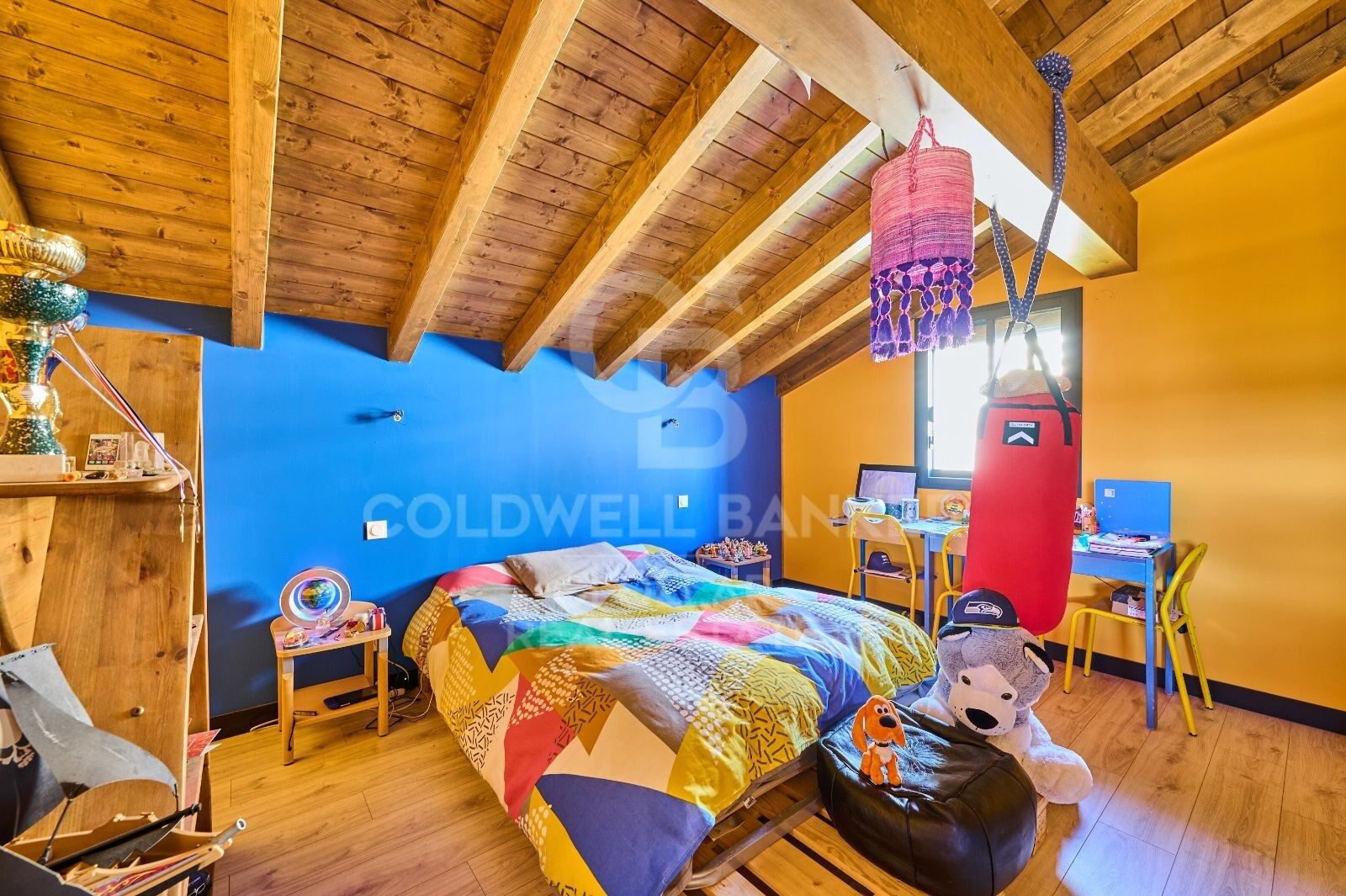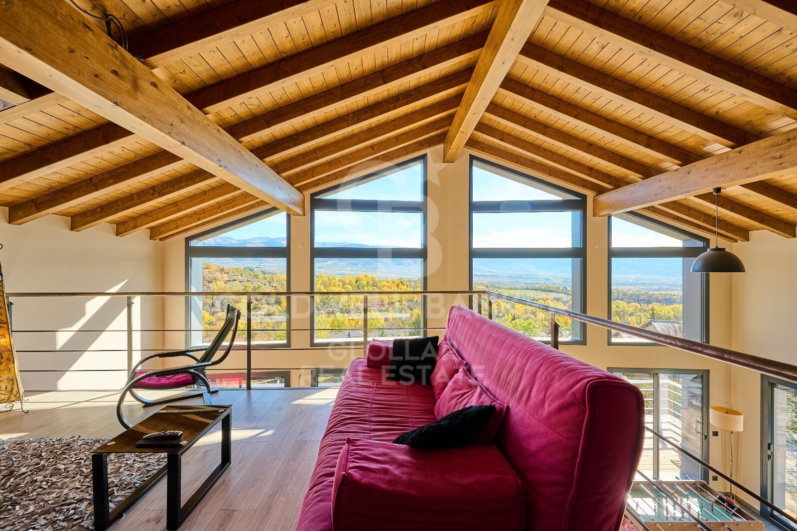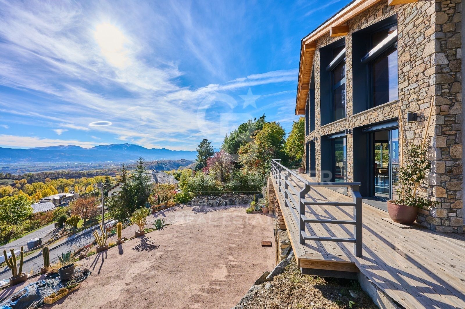 Exclusiva residencia ubicada en el pueblo de Angoustrine. Esta casa de diseño vanguardista, se encuentra en una parcela de 1.800m², fusionando a la perfección la arquitectura moderna con la calidez de los elementos naturales. Al entrar, te recibirán unos altos techos de madera que crean una sensación de amplitud y elegancia. Los acogedores volúmenes de la vivienda se despliegan en cada rincón, ofreciendo un ambiente envolvente y sofisticado. La propiedad se encuentra estratégicamente posicionada para aprovechar al máximo las vistas panorámicas que se extienden desde todos los ángulos y la orientación solar. La joya de la corona es el impresionante salón comedor, inundado de luz gracias a sus grandes cristaleras que enmarcan el paisaje circundante. Desde aquí, se accede directamente a una amplia terraza, ideal para disfrutar de momentos de relajación al aire libre. La cocina abierta al comedor, con una elegante barra pasaplatos, añade un toque de modernidad y funcionalidad. En la misma planta, se encuentra una lujosa habitación suite con acceso directo al jardín, una habitación doble con encanto y un aseo de cortesía que completa la planta baja. La planta superior revela una sala diáfana, actualmente destinada a otro salón, donde la creatividad y el confort se encuentran en armonía. Dos habitaciones dobles adicionales y un baño completo proporcionan espacios privados que combinan diseño y practicidad.