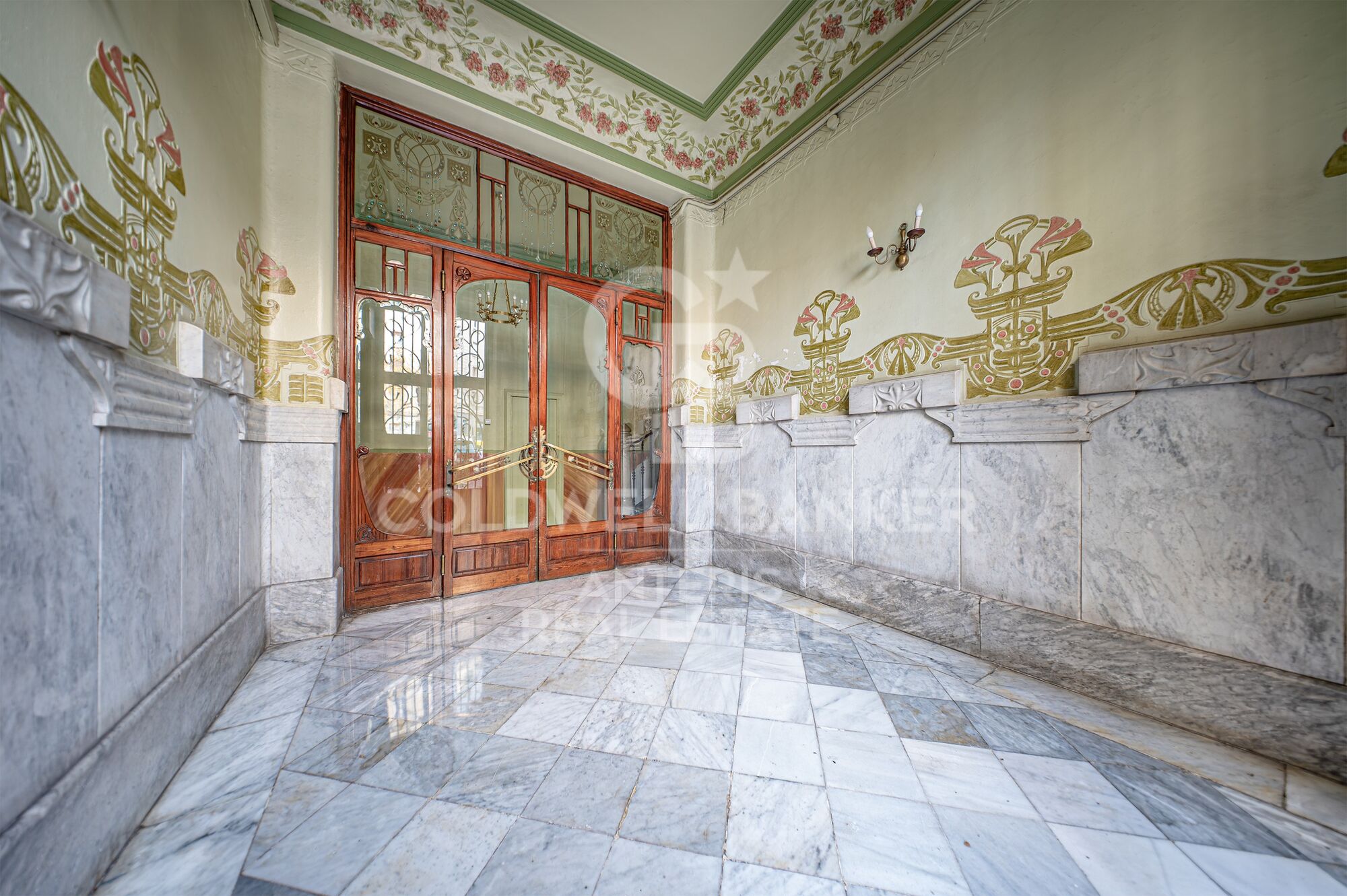 The building has been recently renovated, with a refurbished façade and a lobby that retains its original stucco and paintings.