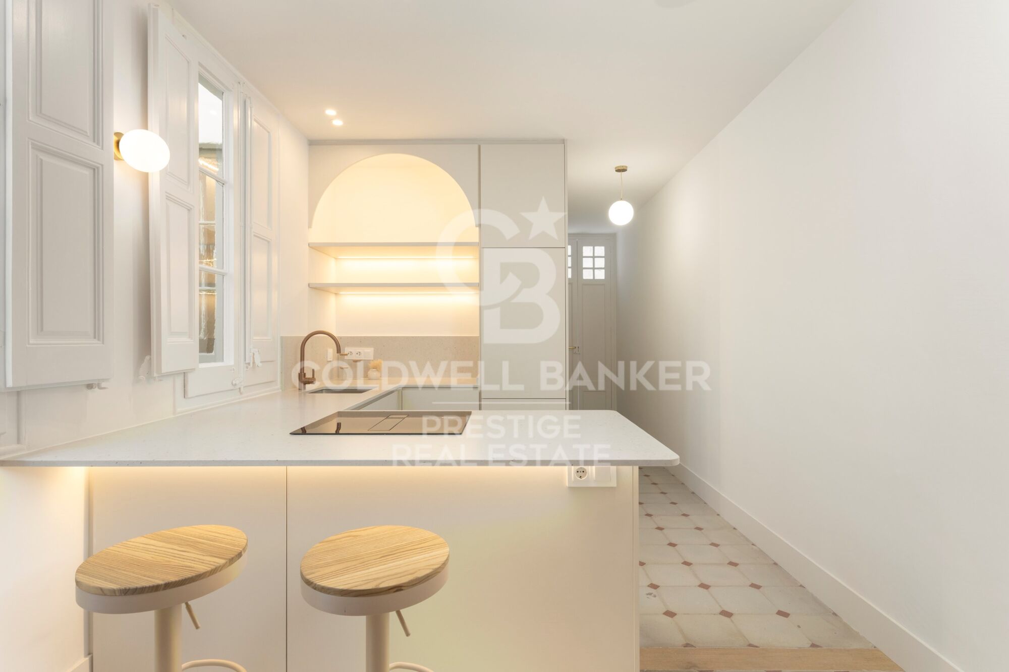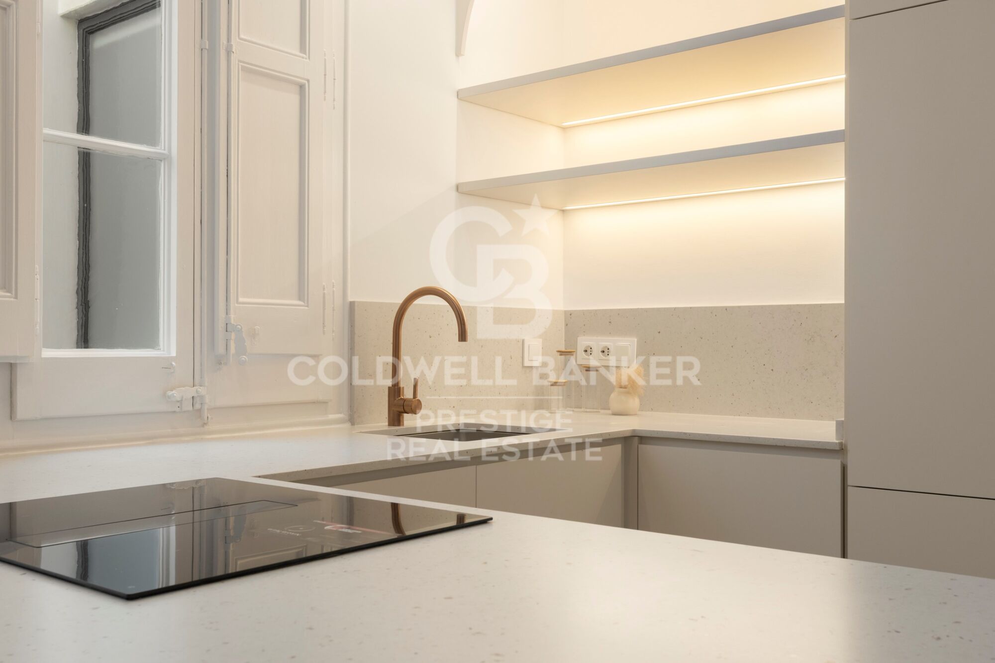 The day area includes a bright, open-plan kitchen and dining space. The kitchen is equipped with modern appliances and optimised for everyday efficiency. The living room opens to a south-facing balcony with views over Carrer de València, providing abundant natural light.