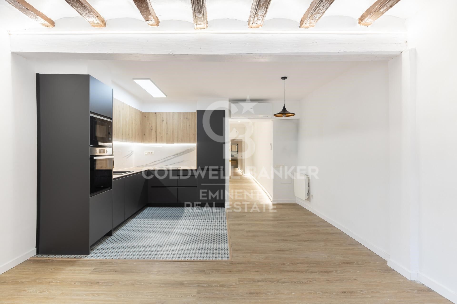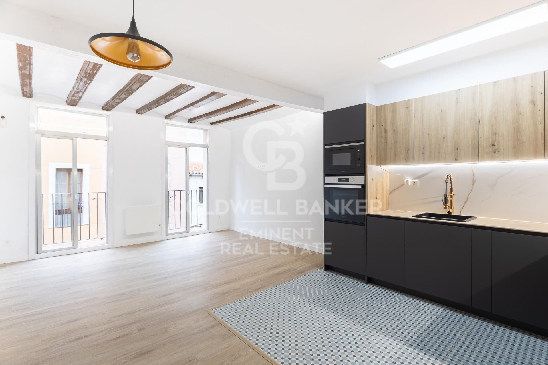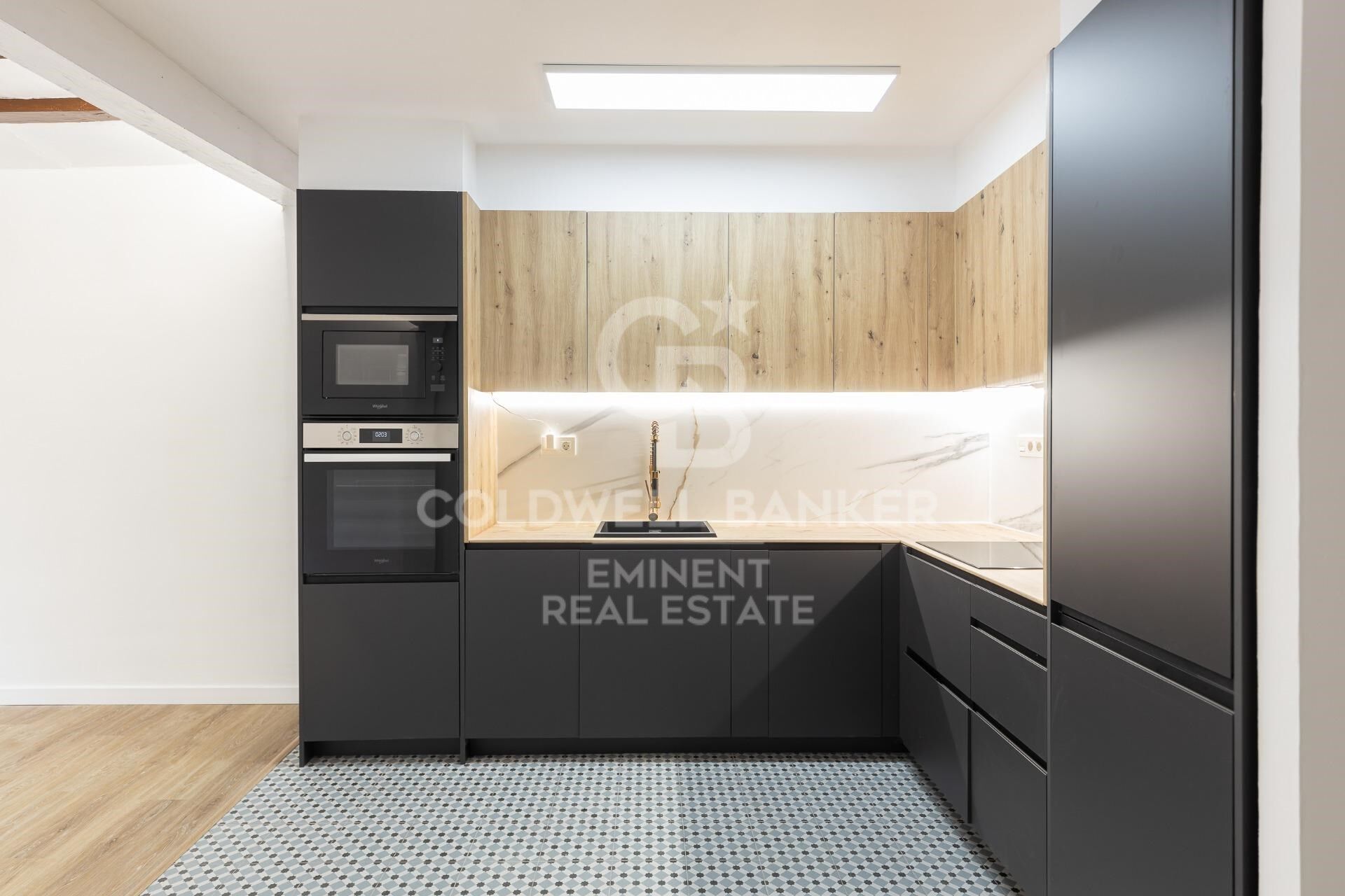 The property has been fully renovated, preserving original elements of great value such as the Catalan vaulted ceilings with wooden beams, which add warmth and authenticity. From the living room, there is access to a charming balcony with two large windows that flood the space with natural light.