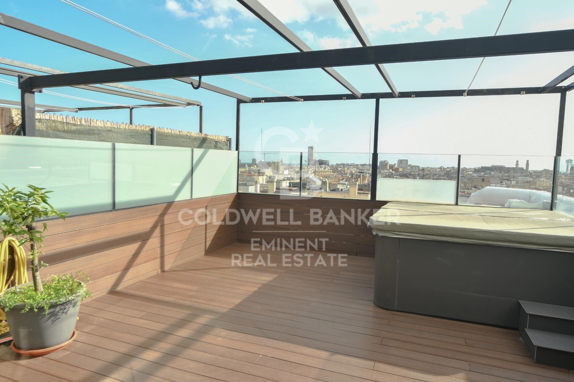 Dream penthouse with large private terrace in a prime location We present this exclusive and characterful penthouse, located on one of the most sought-after streets in the neighbourhood. A truly unique home that perfectly blends original charm with modern comfort. With a total area of 172 m² (131 m² built plus 41 m² terrace), this property stands out for its high ceilings and exposed wooden beams, creating a warm and elegant atmosphere. The large private terrace, facing a quiet courtyard and offering open views, is an ideal oasis to relax, enjoy the sun, or entertain family and friends. The spacious living-dining room, filled with natural light from four exterior balconies, connects seamlessly with the open-plan kitchen, fully equipped with top-quality appliances and an integrated wine cooler. The night area features two generous bedroom suites, each with its own walk-in closet and private bathroom, ensuring both comfort and privacy. The master suite also enjoys a small balcony facing Carrer Rosic, bathed in morning sunlight. There is also an architect's proposal available to convert the layout into three bedrooms (see floor plan in the photos). The building, dating from 1900, is in excellent condition and features an elevator for easy access. The property can be delivered furnished or unfurnished, according to your needs. An exclusive penthouse, ready to move into, located in one of the most charming and vibrant areas of the city. #ref:CBES3477
