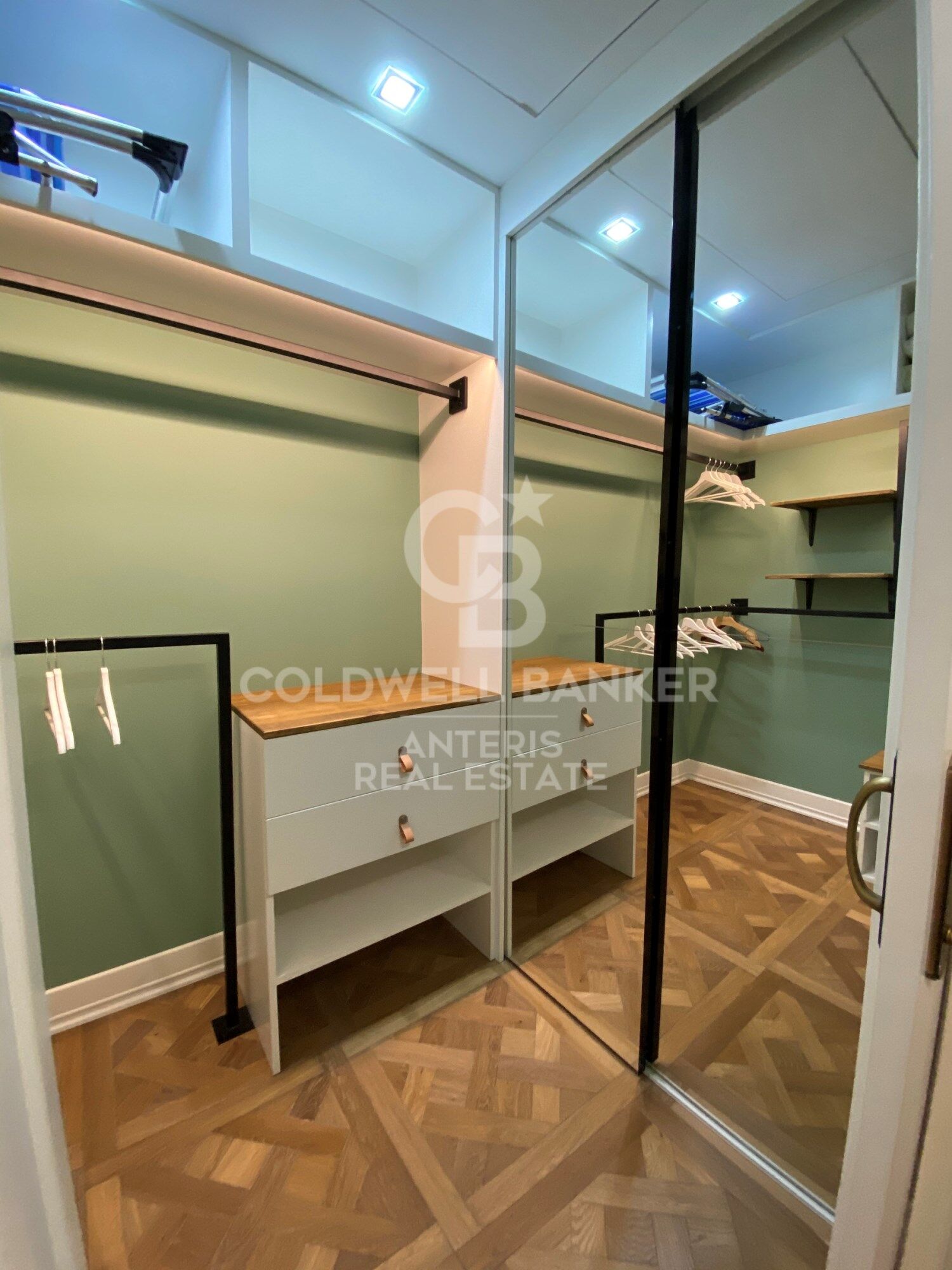 The apartment features two bedroomsone double and one medium-sizedtwo full bathrooms, and a bright living-dining area with an open-plan kitchen and access to two balconies overlooking the street. The high-quality renovation includes natural wood parquet flooring, high ceilings, ducted hot-and-cold air conditioning, aluminum windows with triple glazing, and fully equipped kitchen. A standout feature is the spacious walk-in wardrobe, a highly valued addition.