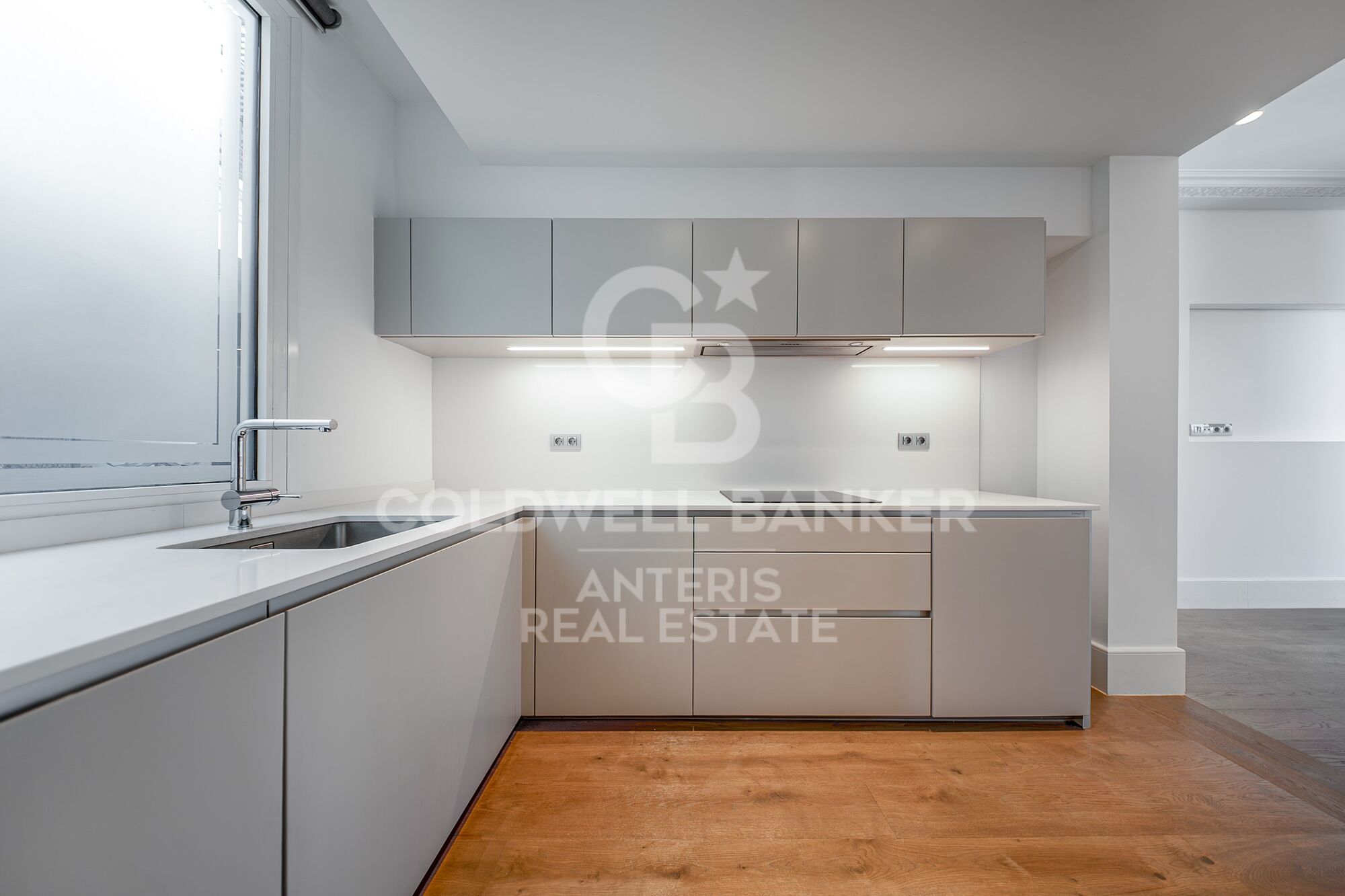 The fully equipped kitchen blends seamlessly and elegantly into the main living area. The living and dining room features three balconies, filling the space with abundant natural light.